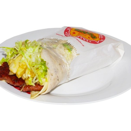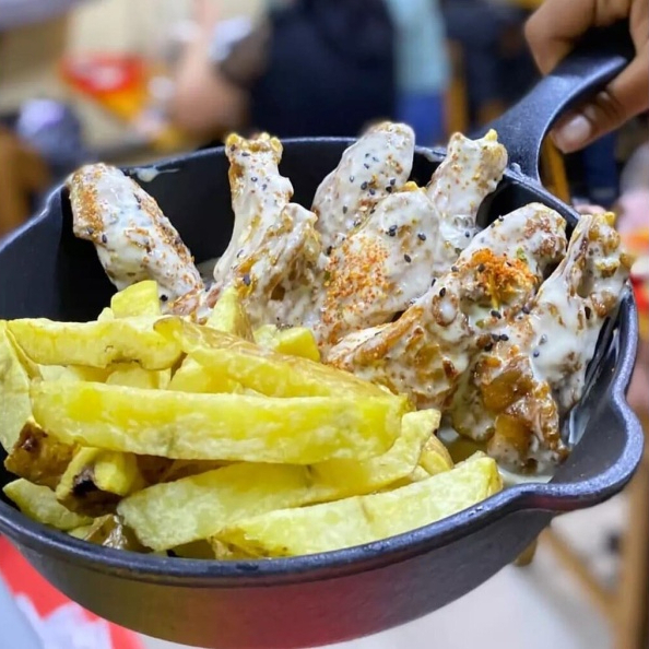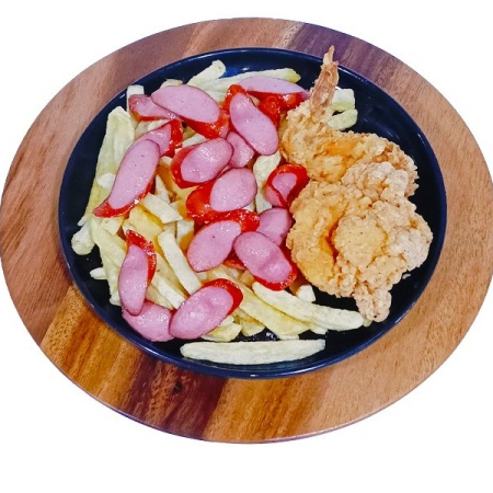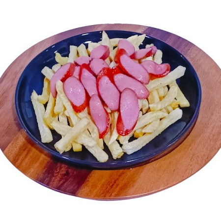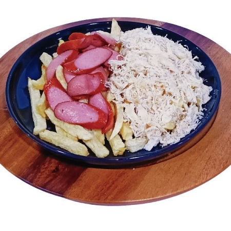 Pollo deshilachado, salchicha, papa frita y ensalada.