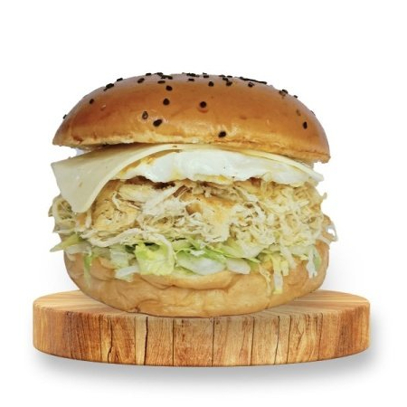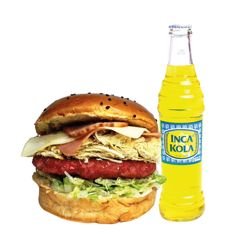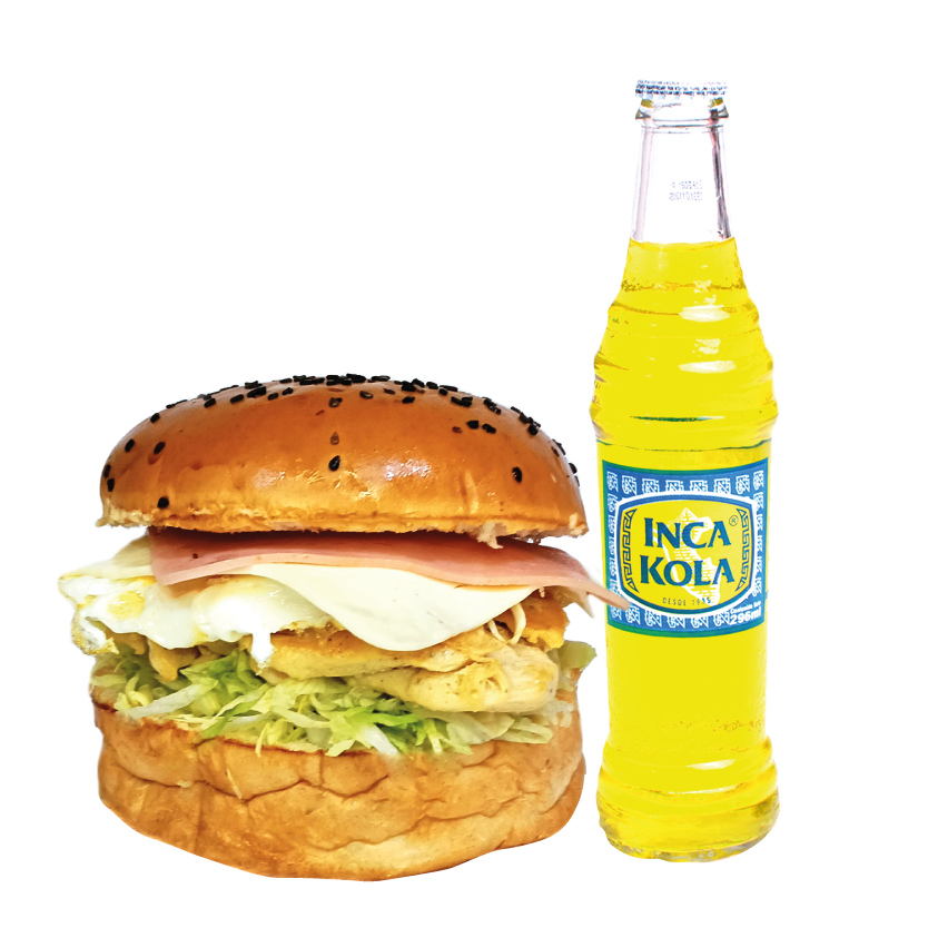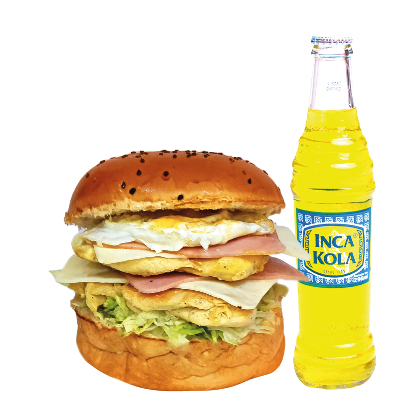 Doble filete de pollo, doble queso, doble jamón, huevo, gaseosa, papas, ensalada y salsas.