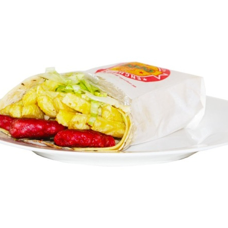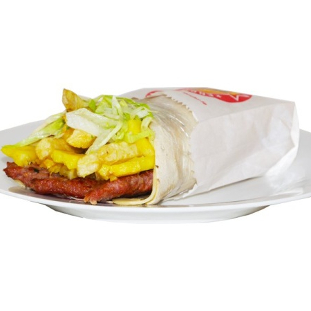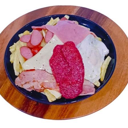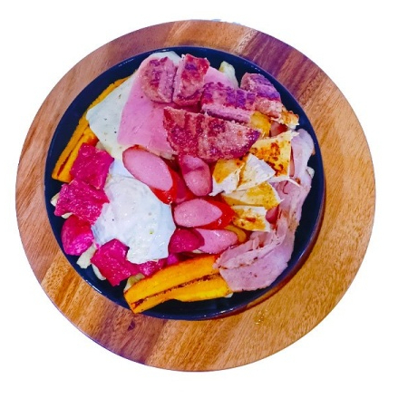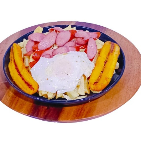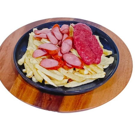 Chorizo, salchicha, papa frita, tocino, queso, jamón, huevo y ensalada.