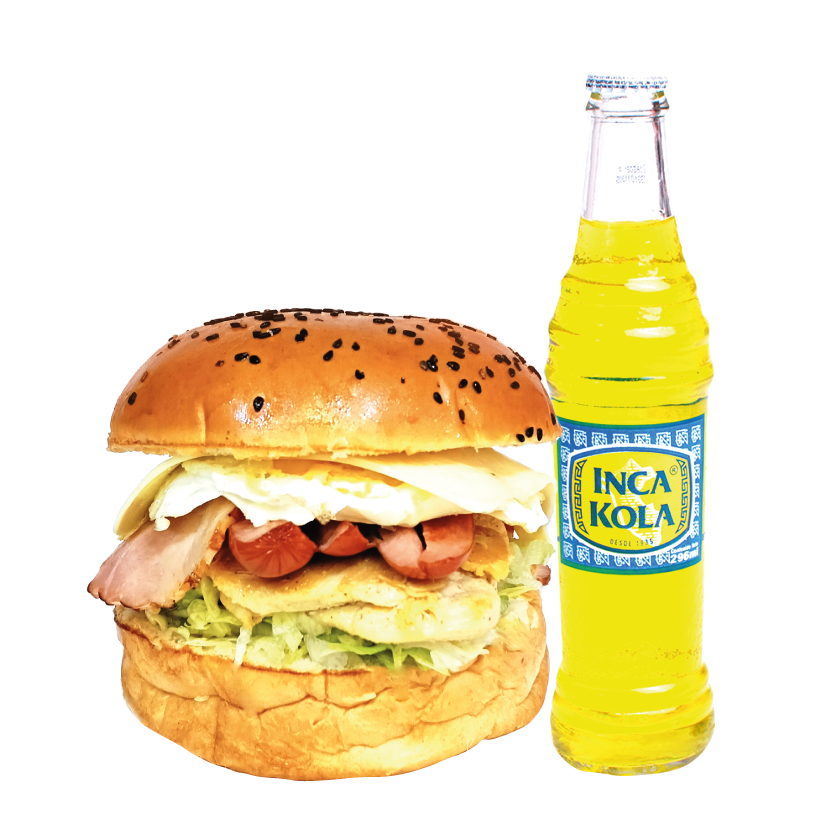3 Hamburguesas royal, 2 salchipapas con filete y 1 gaseosa de un litro y medio.