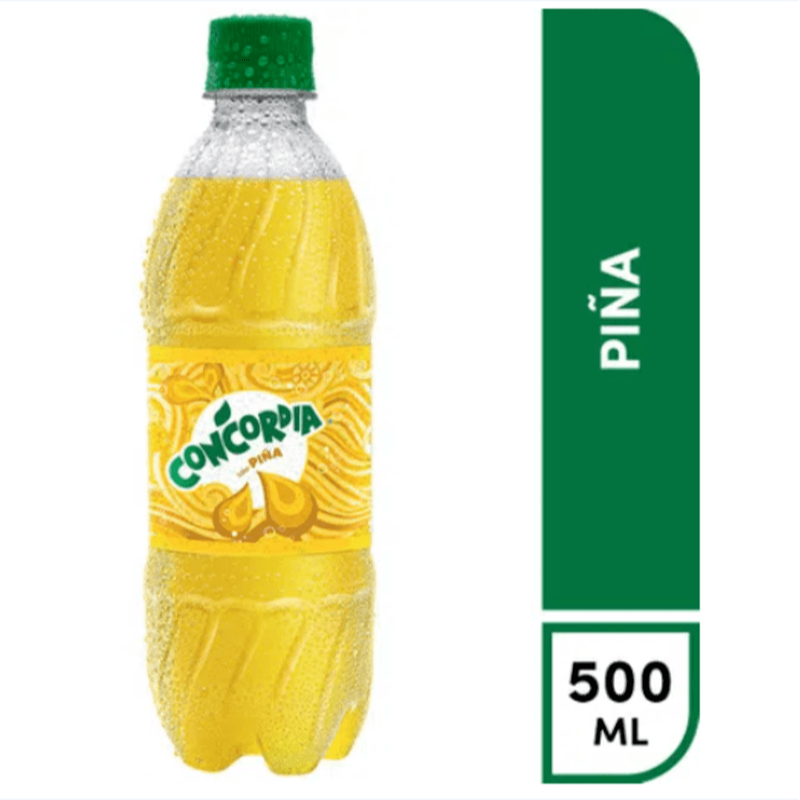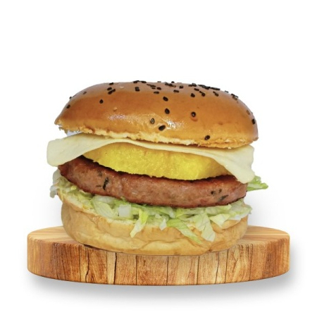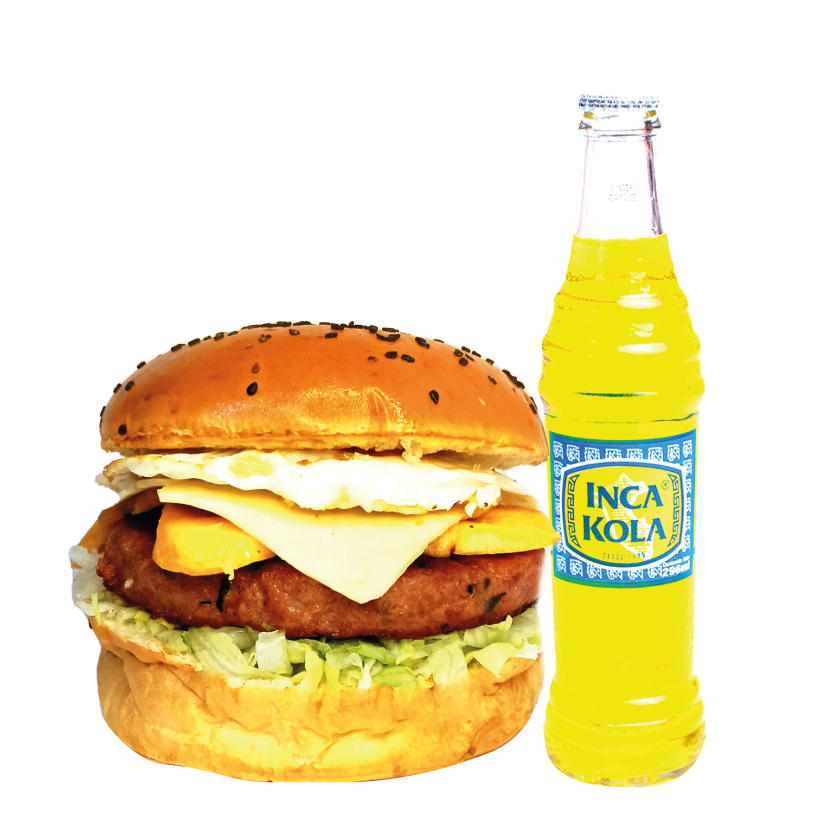Hamburguesa de la casa, doble rodaja de piña, queso, tocino, gaseosa, papas, ensalada y salsas.