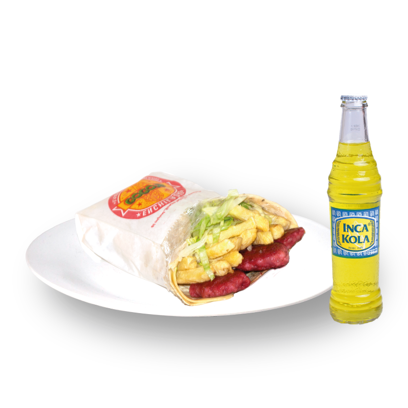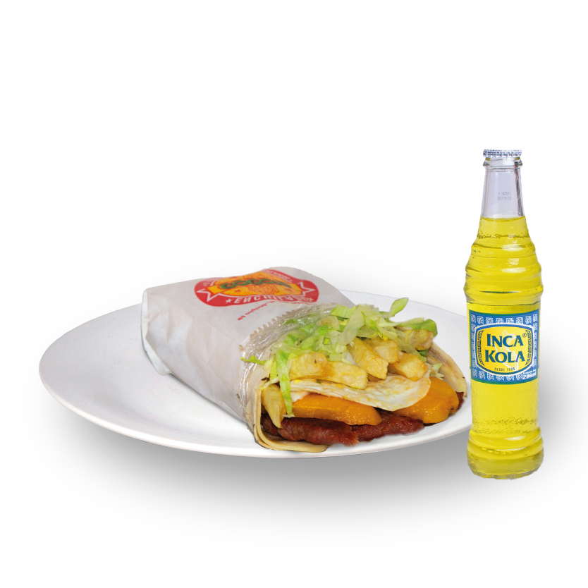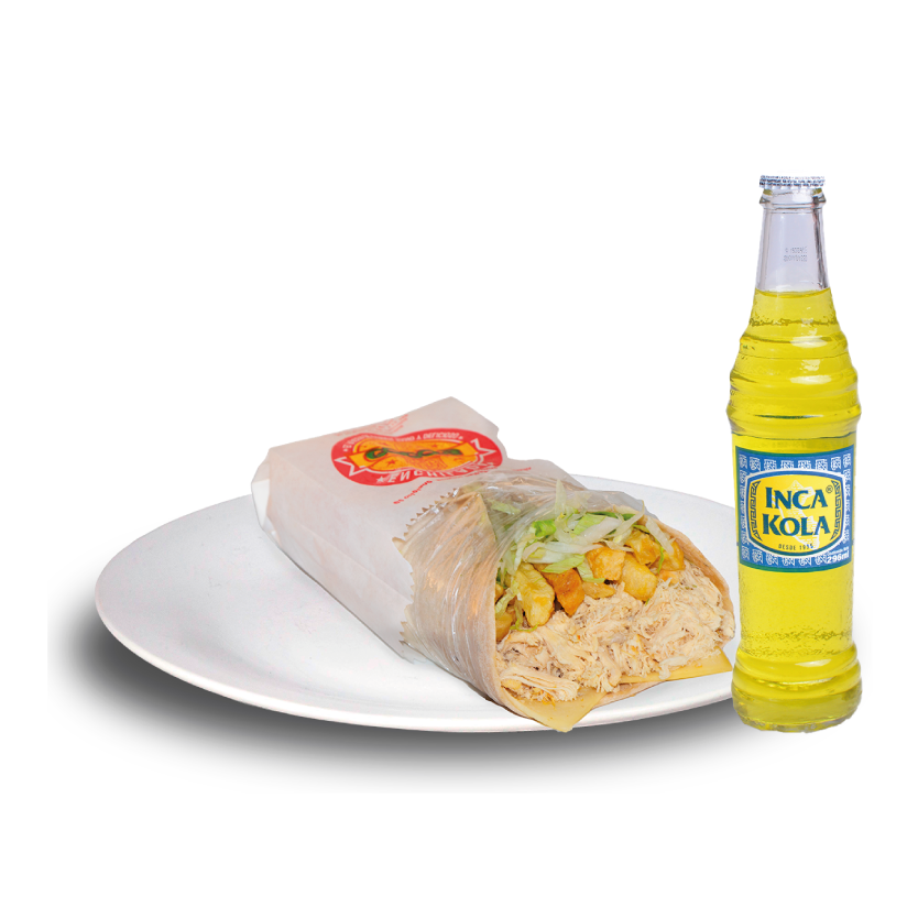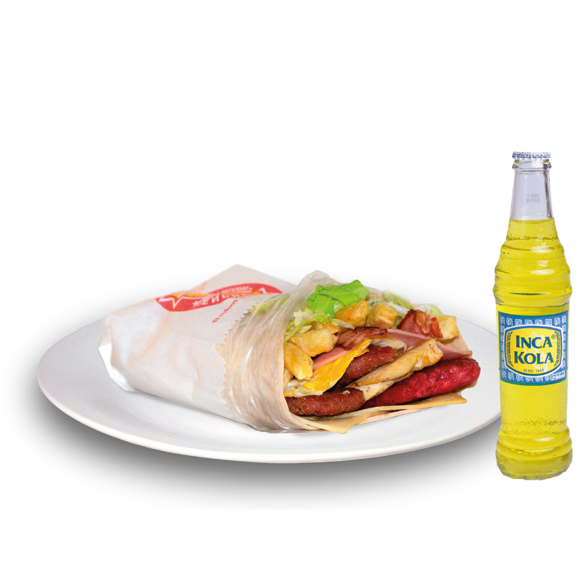 Pollo deshilachado, chorizo, queso, jamón, tocino, gaseosa, papas, salsas y ensalada.