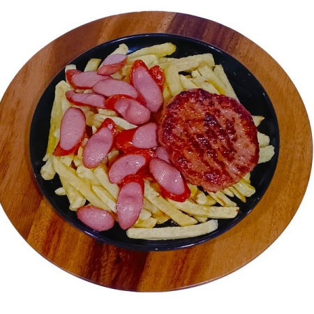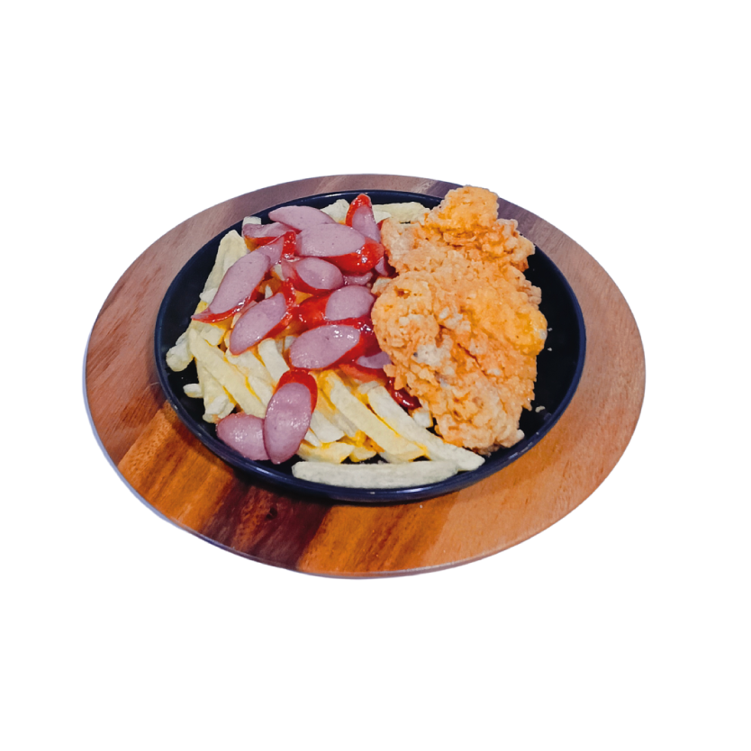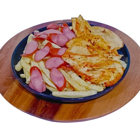 Filete de pollo, salchicha, papa frita, ensalada y salsas.