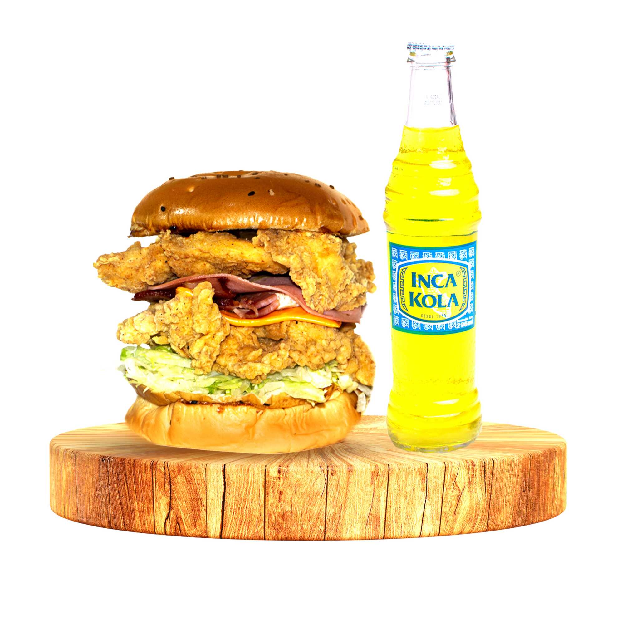 Doble filete de pollo, doble queso, doble jamón, huevo, gaseosa, papas, ensalada y salsas.