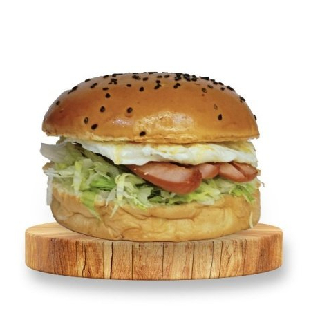 Hamburguesa de casa, doble queso, huevo, gaseosa, salsas, papa y ensalada.