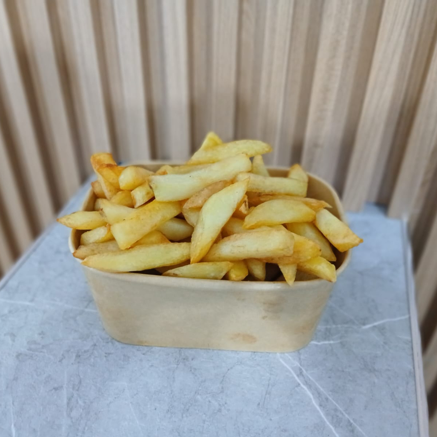 Abundante porción de papas fritas crujientes y doradas al momento, perfectas para compartir, acompañadas de deliciosas cremas de la casa.