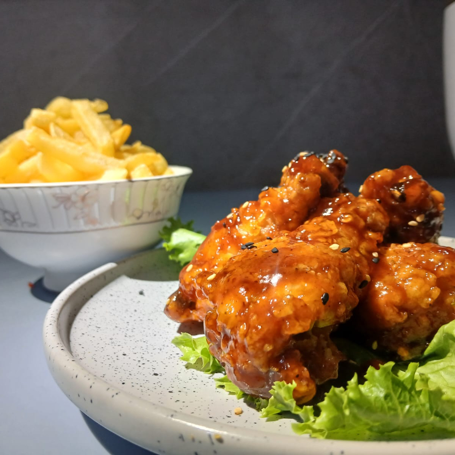 Alitas de pollo crujientes bañadas en salsa bbq dulce y ahumada, acompañadas de papas fritas doradas y salsas de la casa.