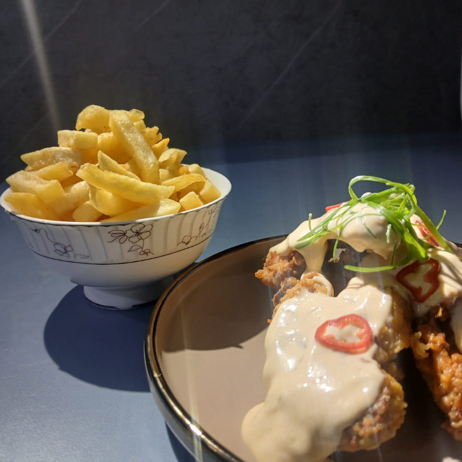Alitas de pollo crujientes bañadas en salsa acevichada cremosa con un toque de limón y ají, acompañadas de papas fritas doradas y salsas de la casa.