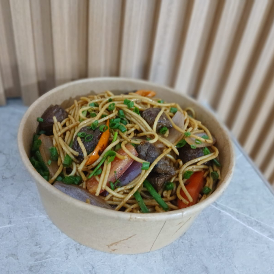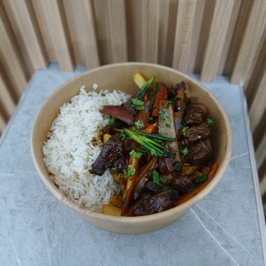 Fideos salteados al wok con jugosos trozos de carne, cebolla, tomate y sillao, al estilo chifa peruano, llenos de sabor y recién preparados.