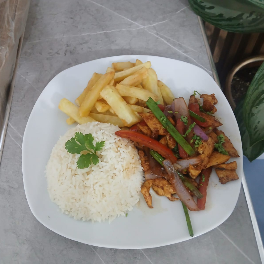 Sabrosos trozos de pollo salteados con cebolla, tomate y papas fritas