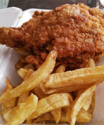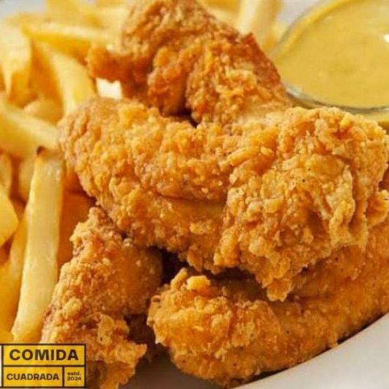 Trozos de pollo crocantes acompañado de papas fritas nativas