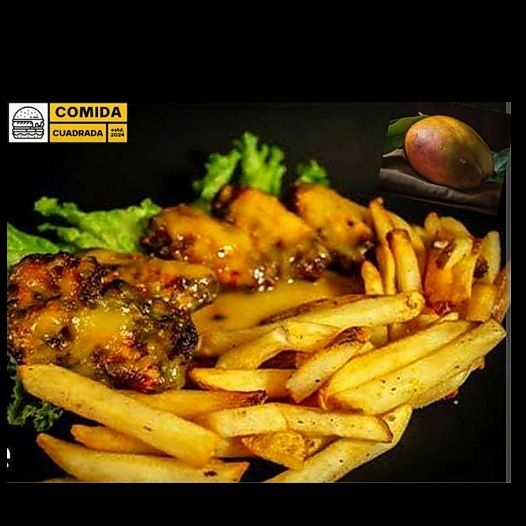 6 piezas de Alitas bañadas en salsa mango habanero acompañado de papas nativas crocantes