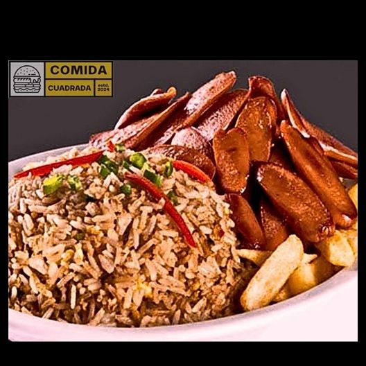 Hot dog ahumado, mas papas fritas nativas crocantes acompañado de porción de arroz chaufa.