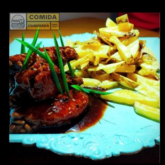 6 piezas de Alitas de pollo bañada en salsa oriental acompañado de papas fritas nativas crocantes