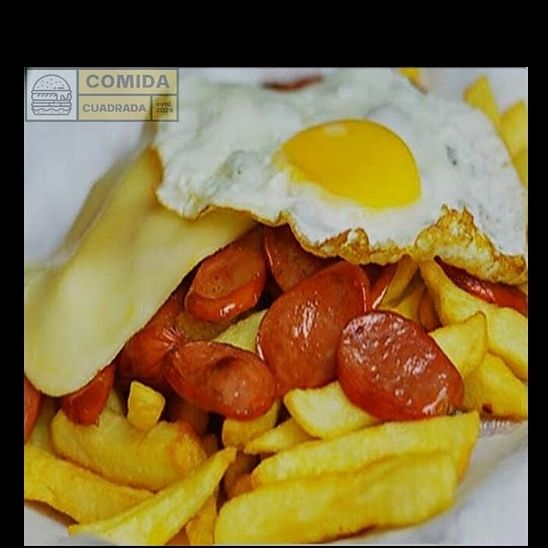 Papas fritas nativas crocantes acompañado de hot dog ahumado más huevo y queso derretido.