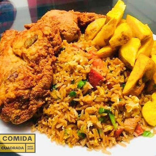 Pieza de pollo broaster, chaufa y papas fritas nativas