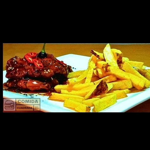 6 piezas de Alitas de pollo bañada en salsa Bbq acompañado de papas fritas nativas crocantes ( este platillo viene en paper de 800, mitas de alitas y mitad de papas )