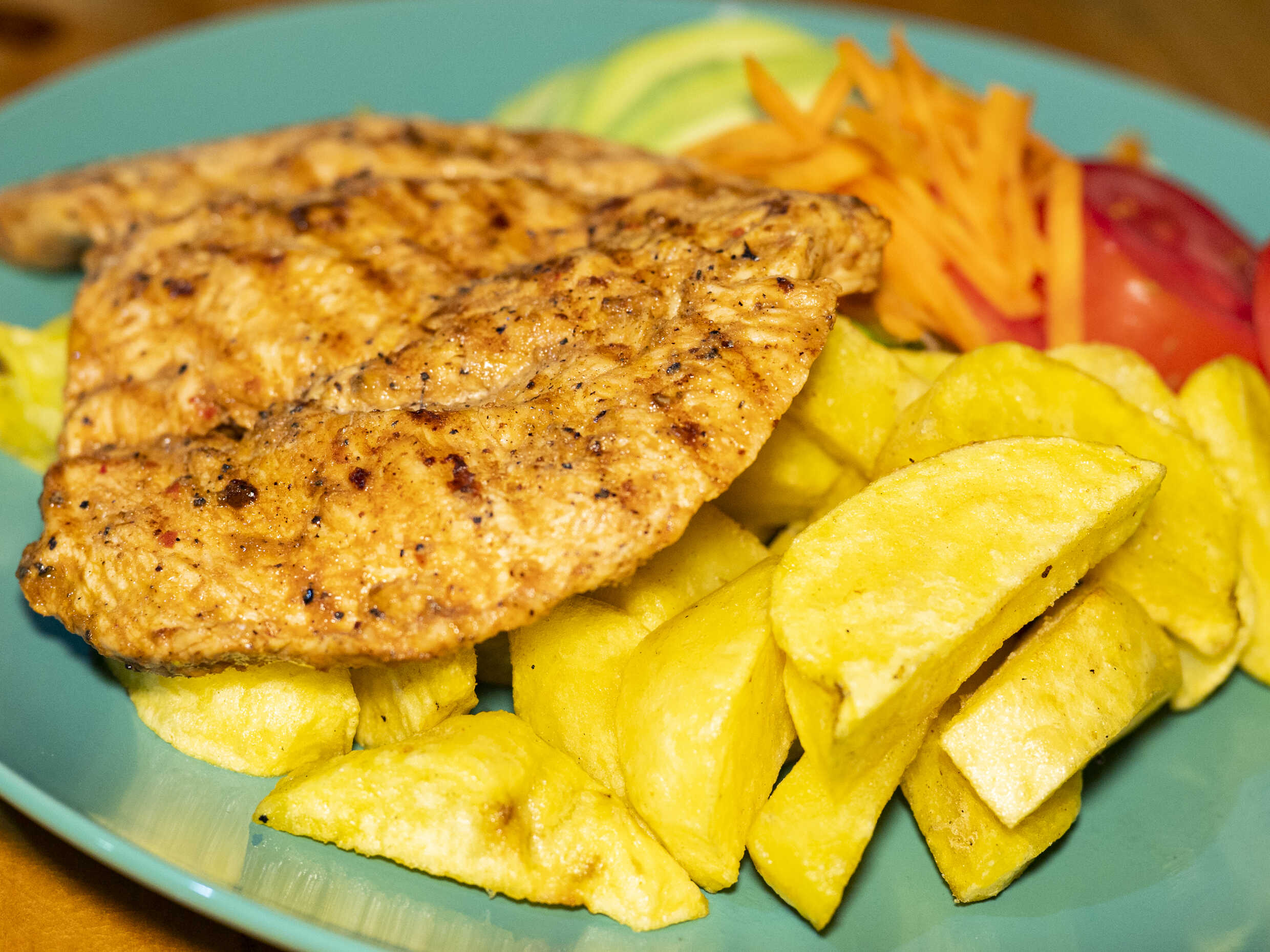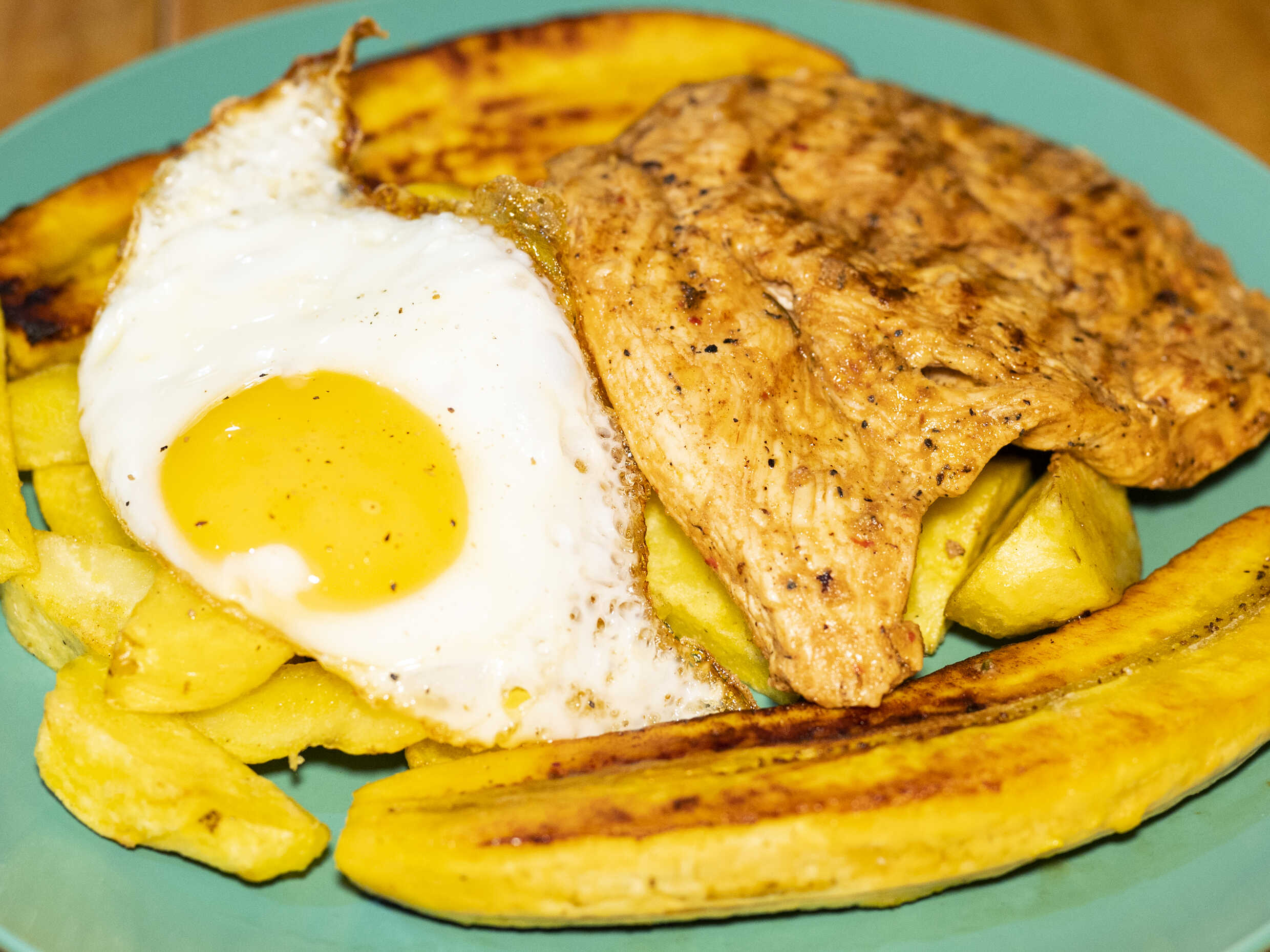 Pechuga de 170 g, papas amarillas fritas o sancochadas, arroz, huevo y plátano frito.