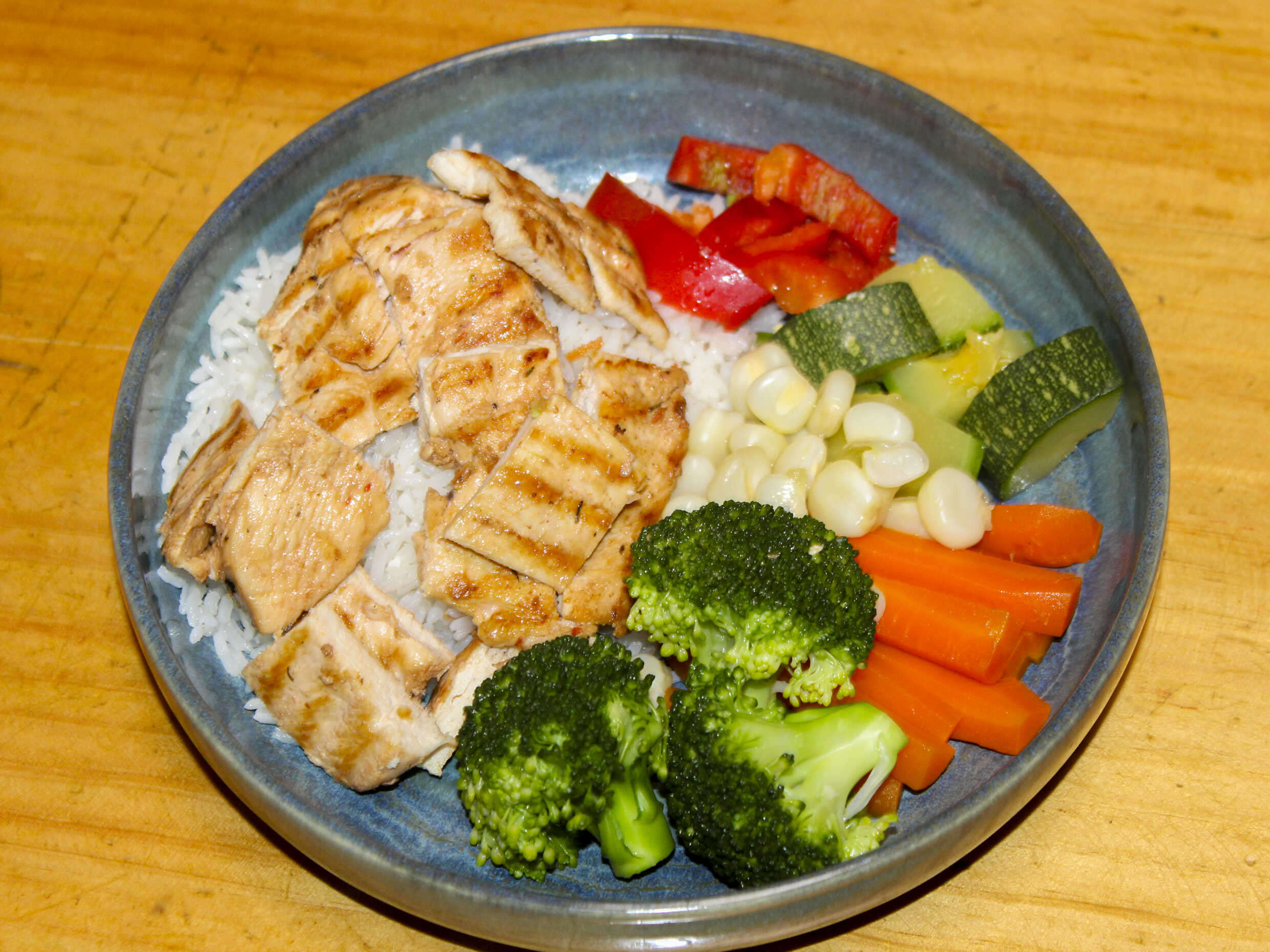 Pechuga de pollo170gr,arroz blaco,palta,vegetales al vapor(vainitas,zanahoria,choclo,brocoli,zucchini)