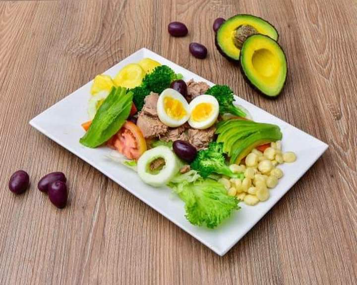 Atún, palta, lechuga, tomate, zanahoria, brócoli, huevo duro, aceitunas, quinua y vinagreta de limón.