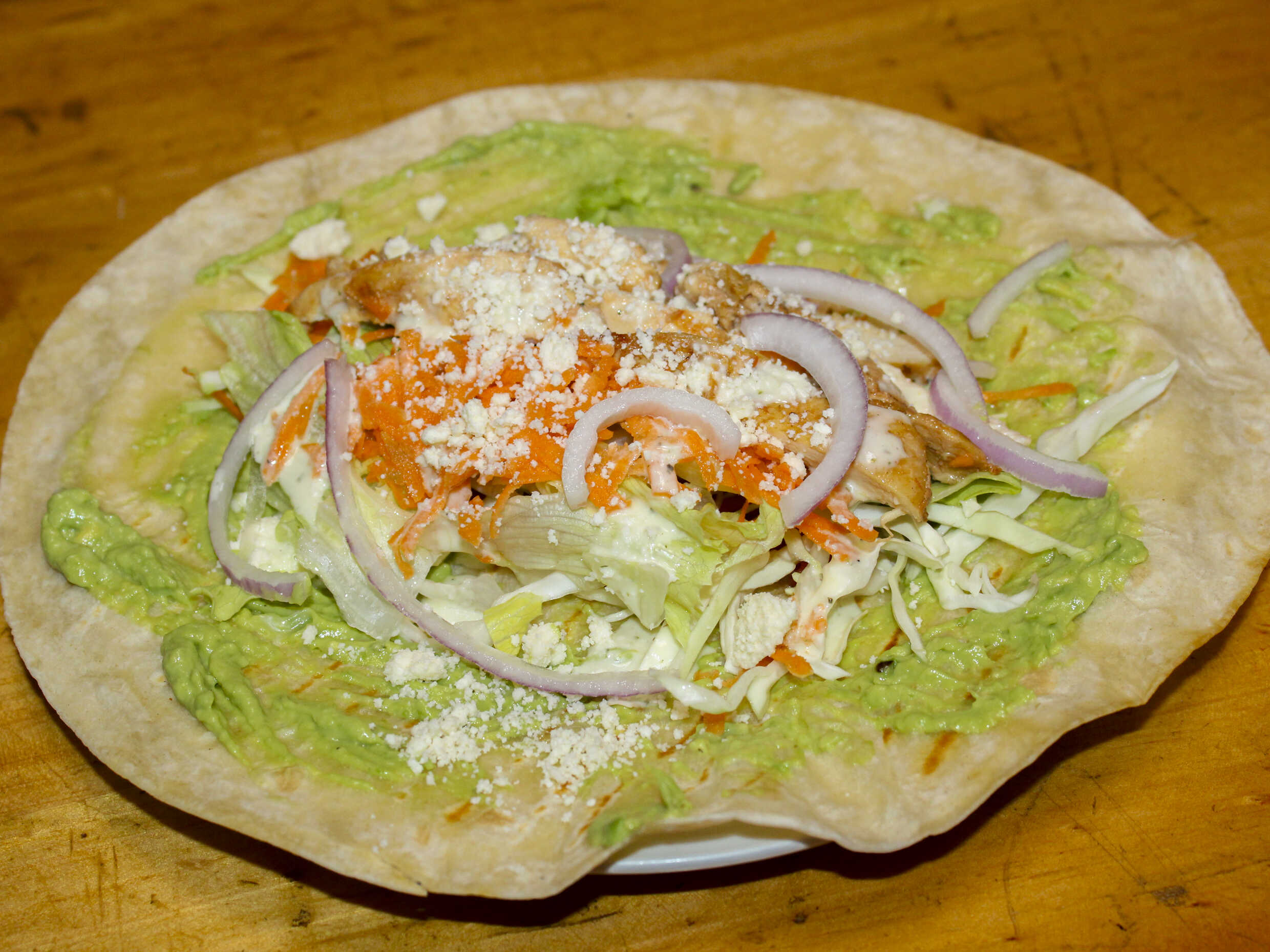Pechuga de pollo, queso, lechuga, lechuga, tomate, palta,huev enrollado en tortilla de trigo.