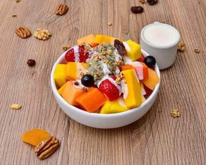 8 Variedades de frutas, yogurt natural, granola, miel y algarrobina.