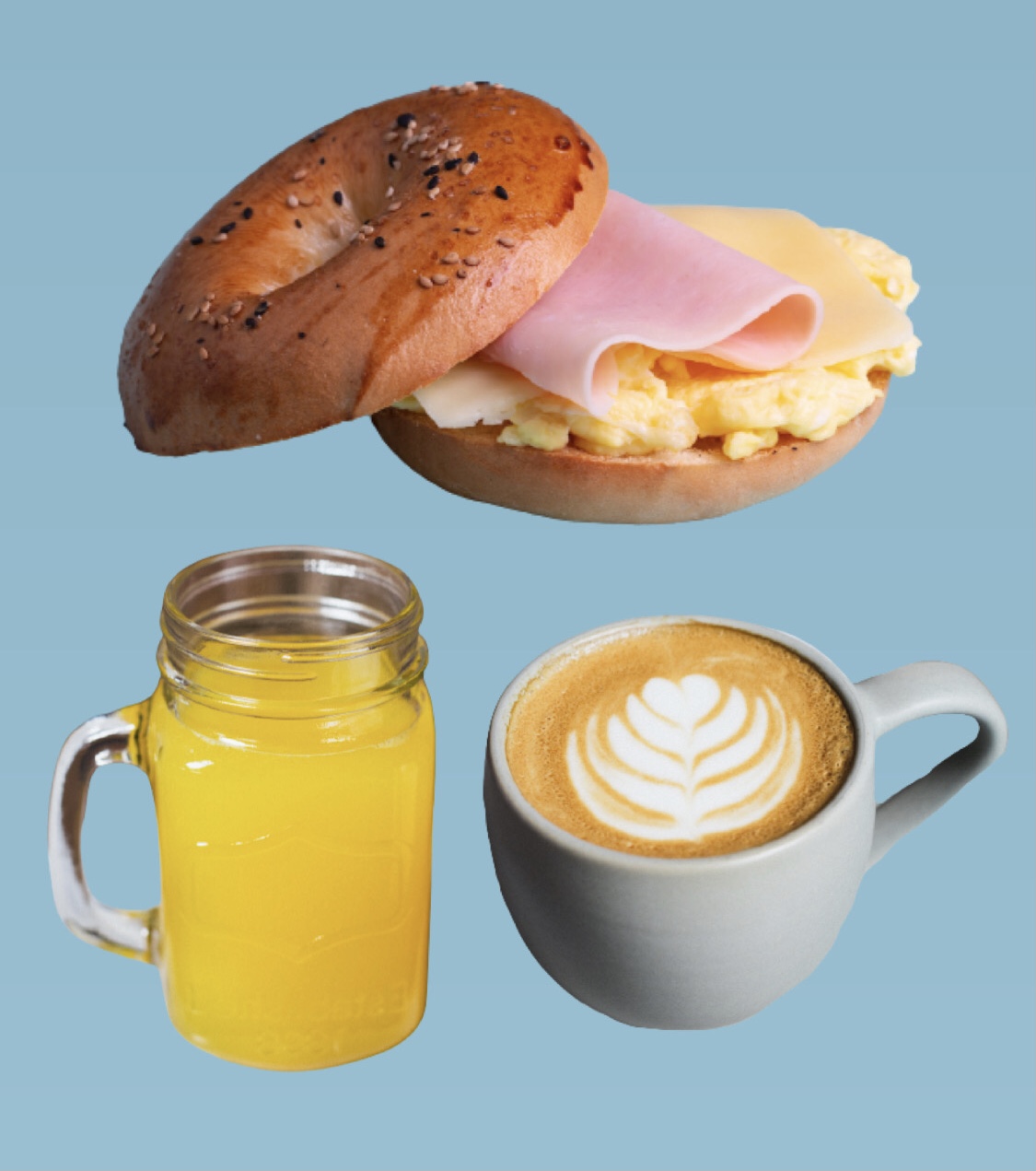 Bagel de huevo, queso y jamón, jugo a elección más café.