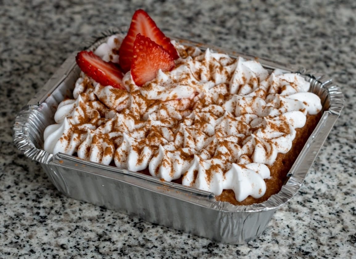 Bizcocho de chocolate bañado en 3 tipos de leches y un toque de cocoa, decorado con chantilly y fresas a elección. 4 a 5 Porciones.