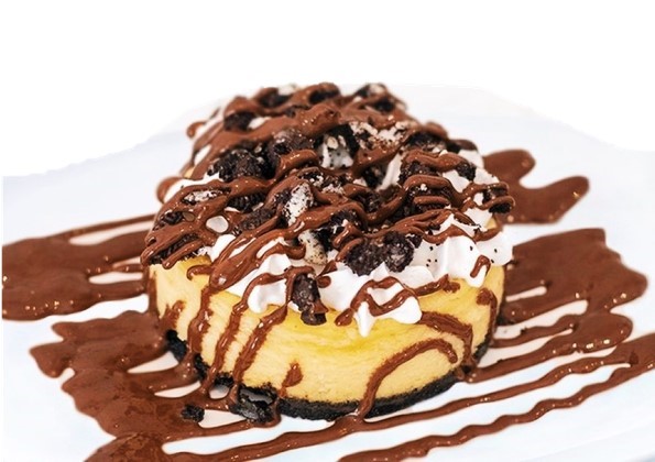Cheesecake estilo New York. Base de galleta oreo, decorado con chantilly, oreos y fudge.