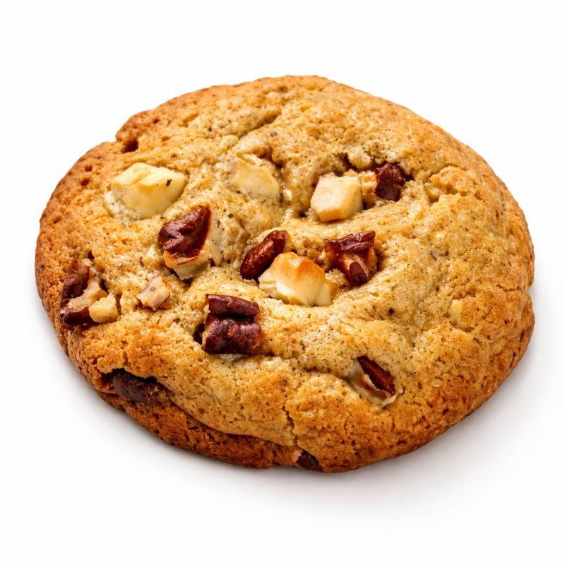 Galleta de vainilla con chips de chocolate blanco y trozos de pecanas tostadas. 125gr.