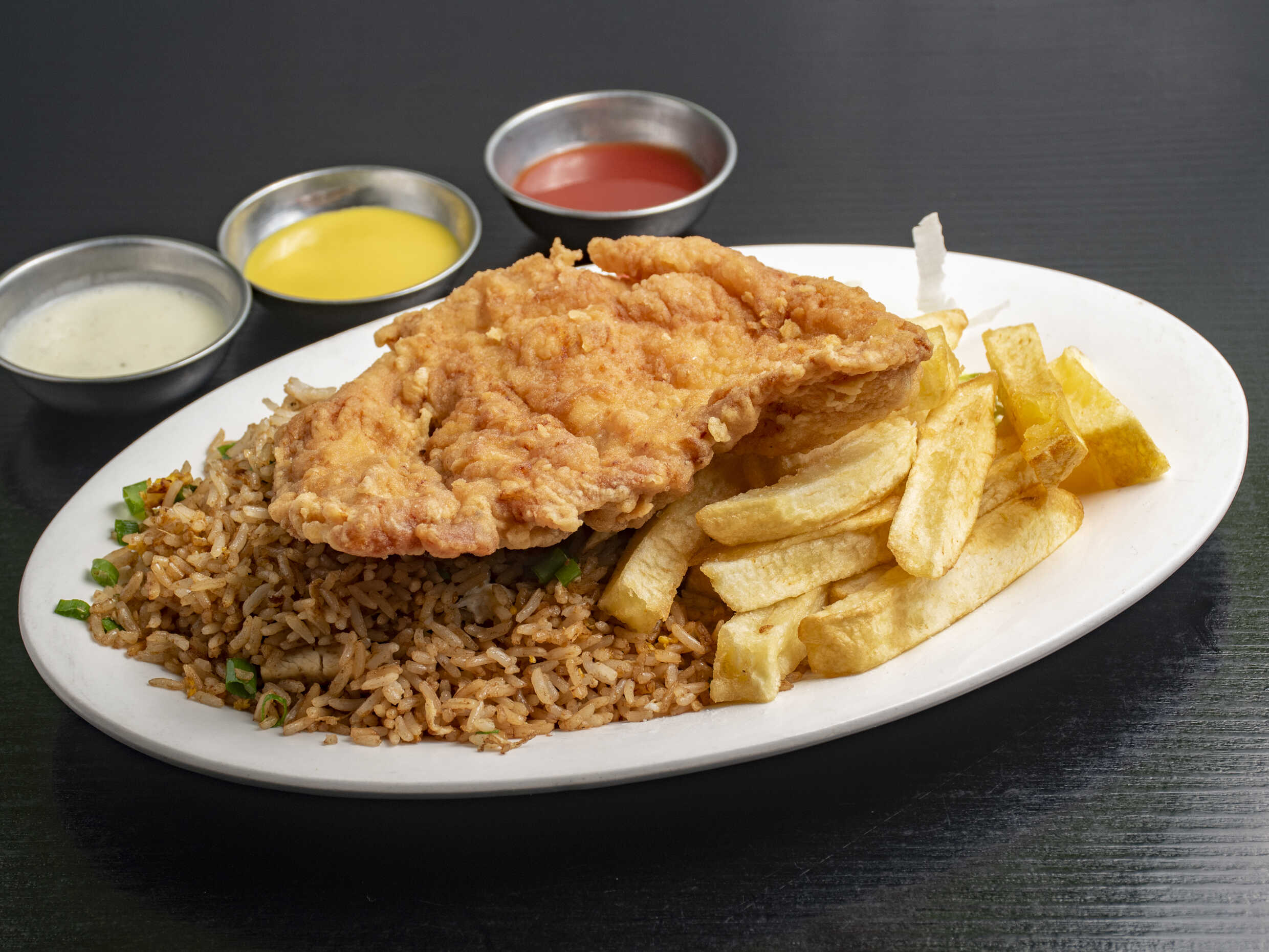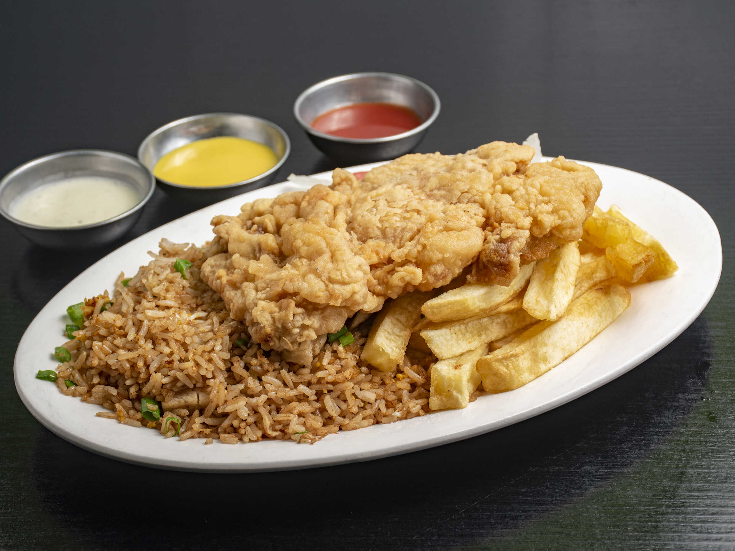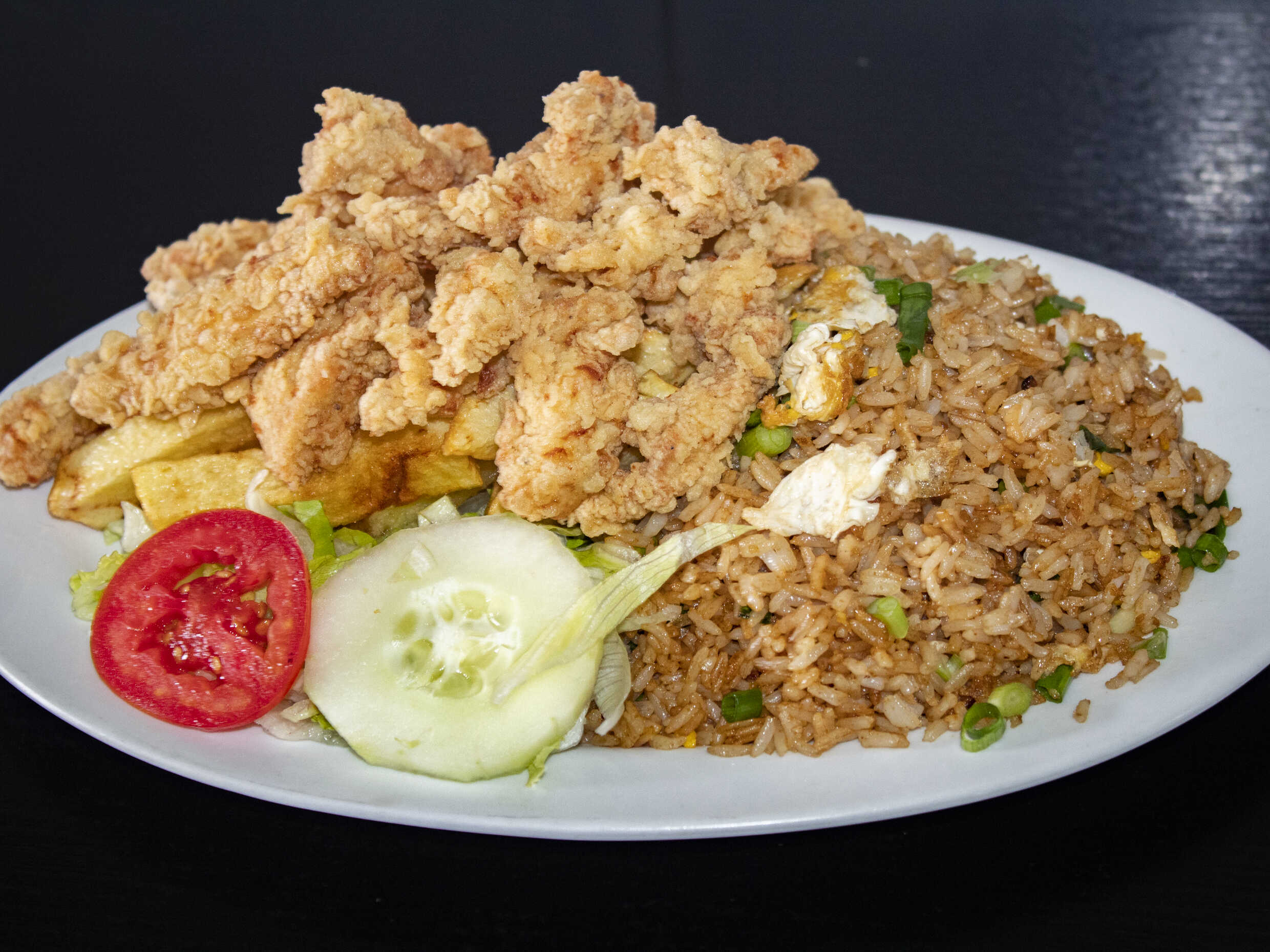Chicharrón jugo de pollo con arroz chaufa recién salteado, papas y ensalada.