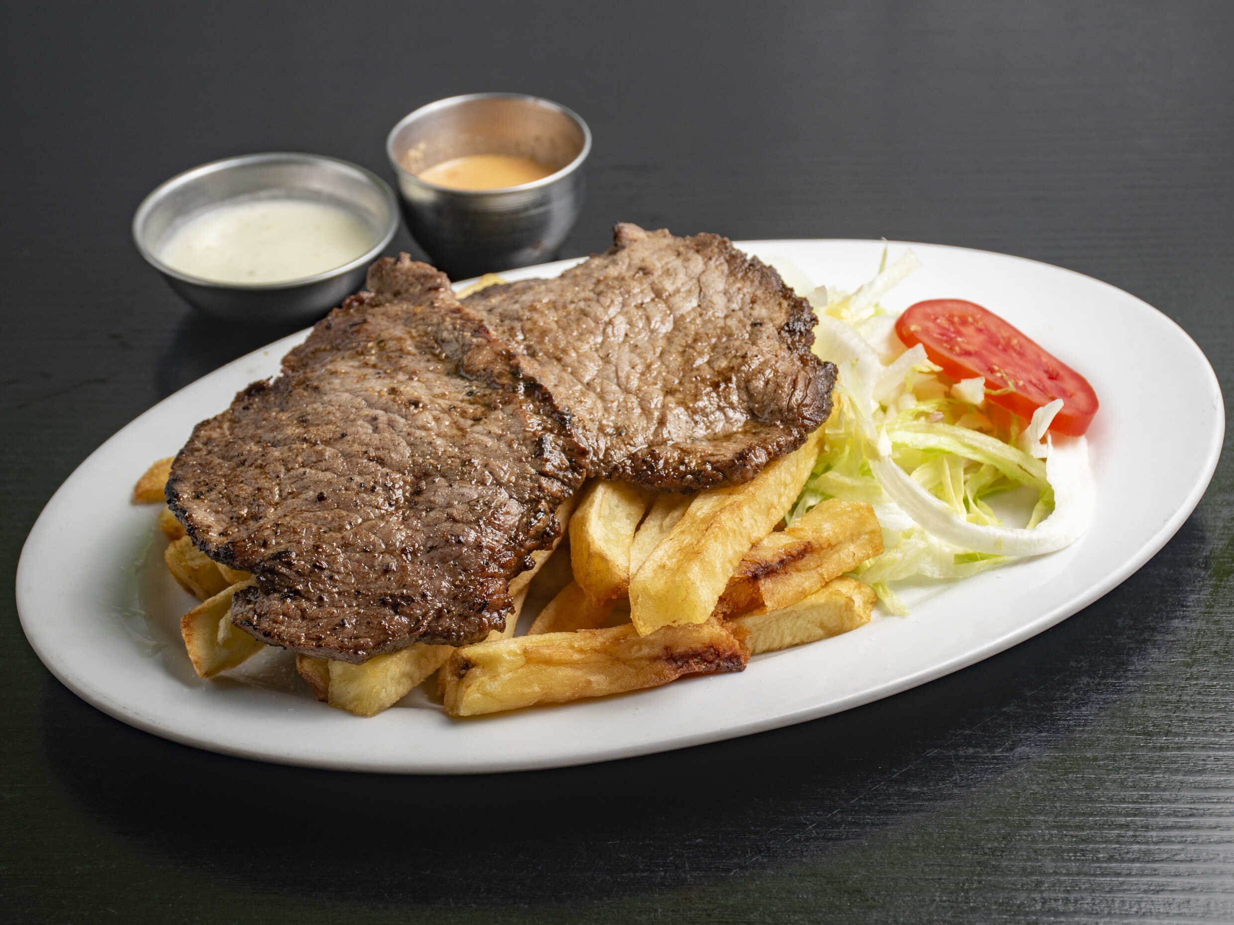 Laja de bistec tierno con papas fritas y ensalada fresca.