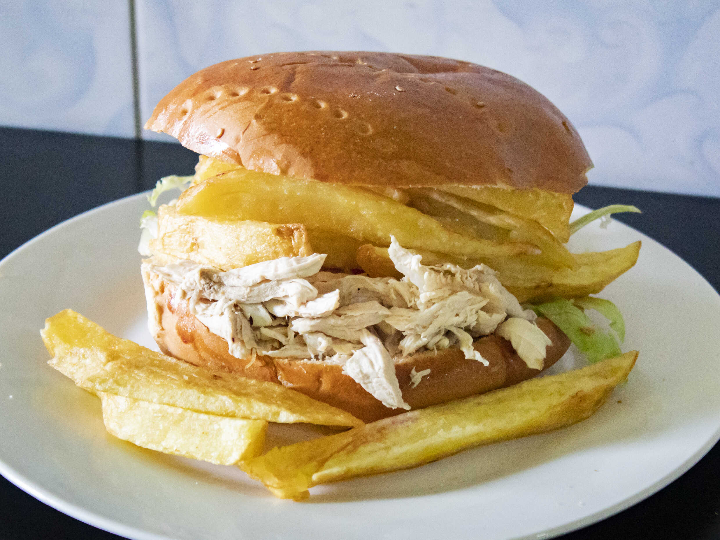Hamburguesa de pollo deshilachado con papas y ensalada.