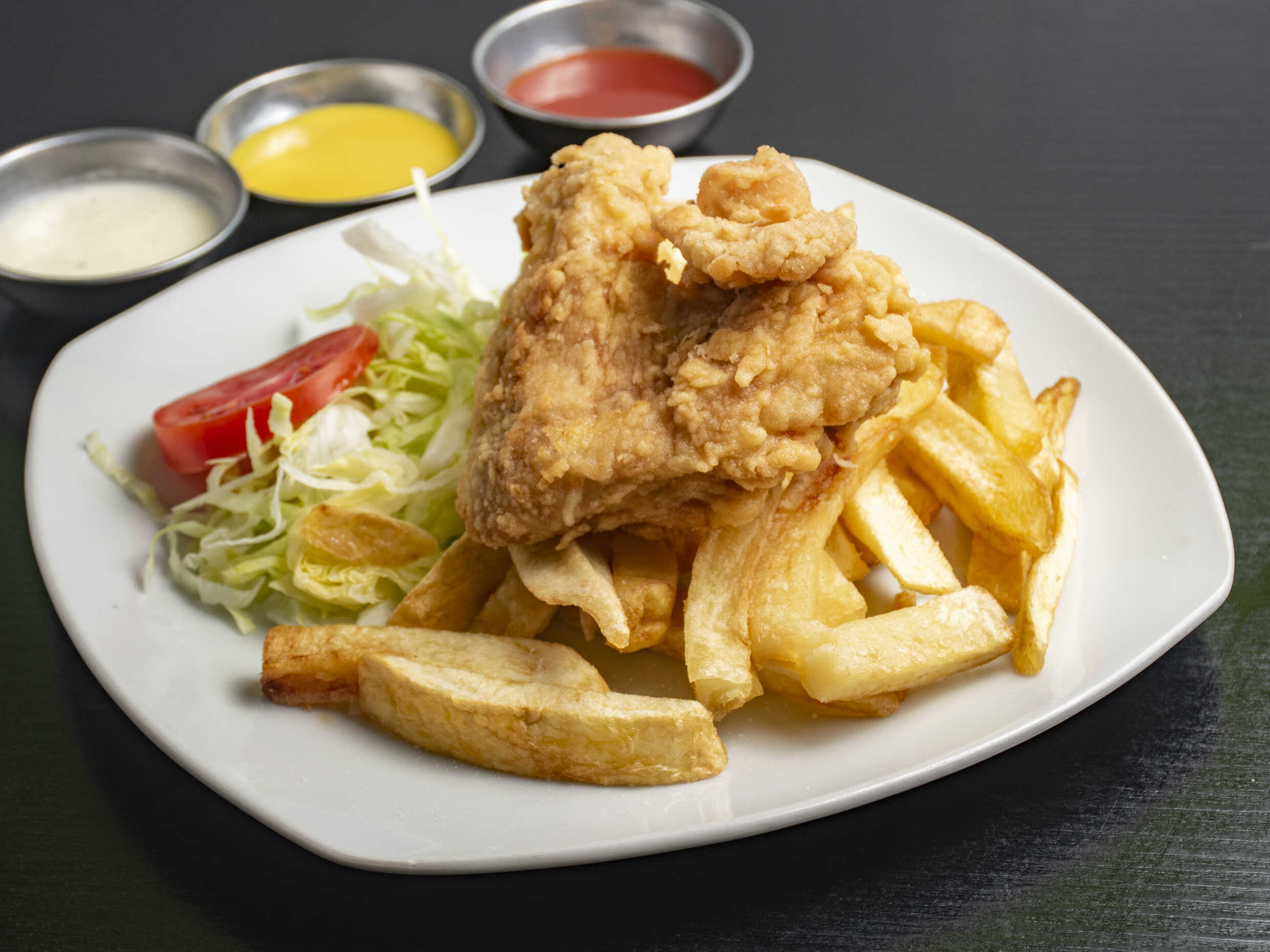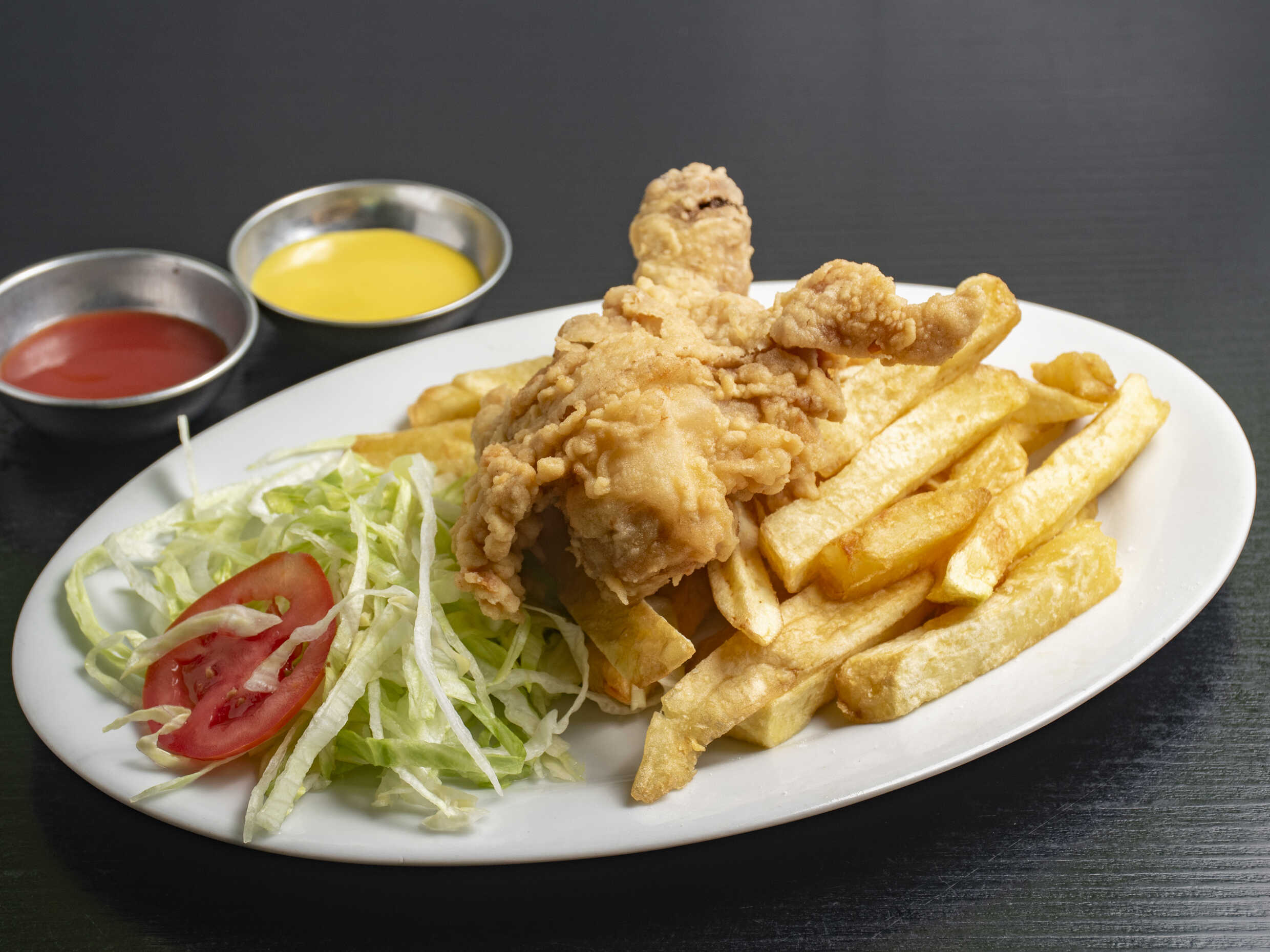 Chicharrón jugoso de pollo acompañado de papas fritas y ensalada