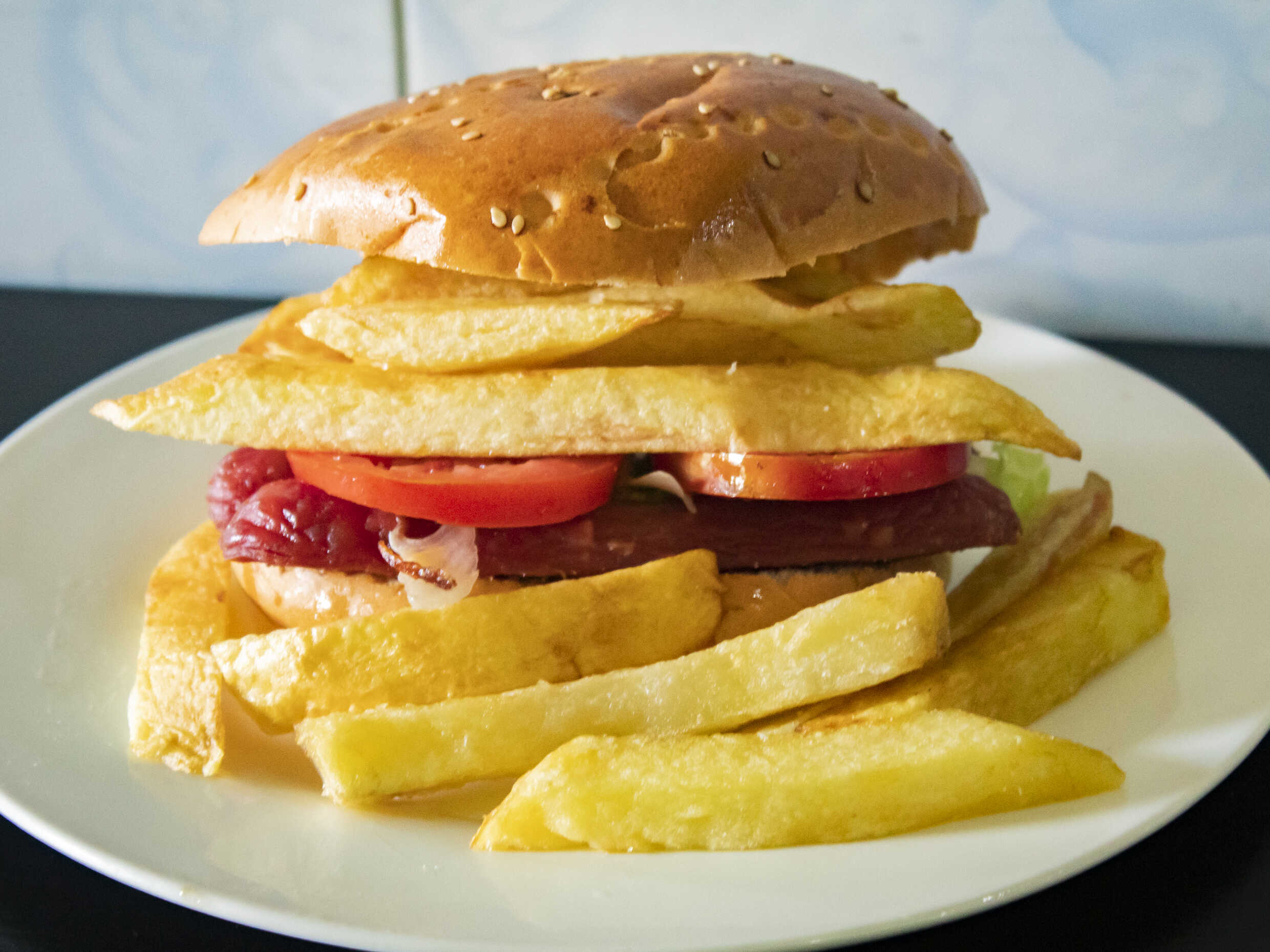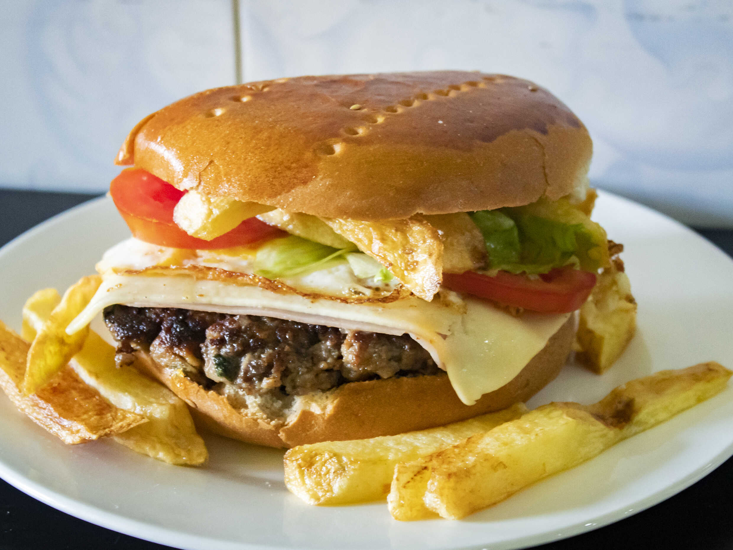 Hamburguesa de carne con huevo, queso y jamón.