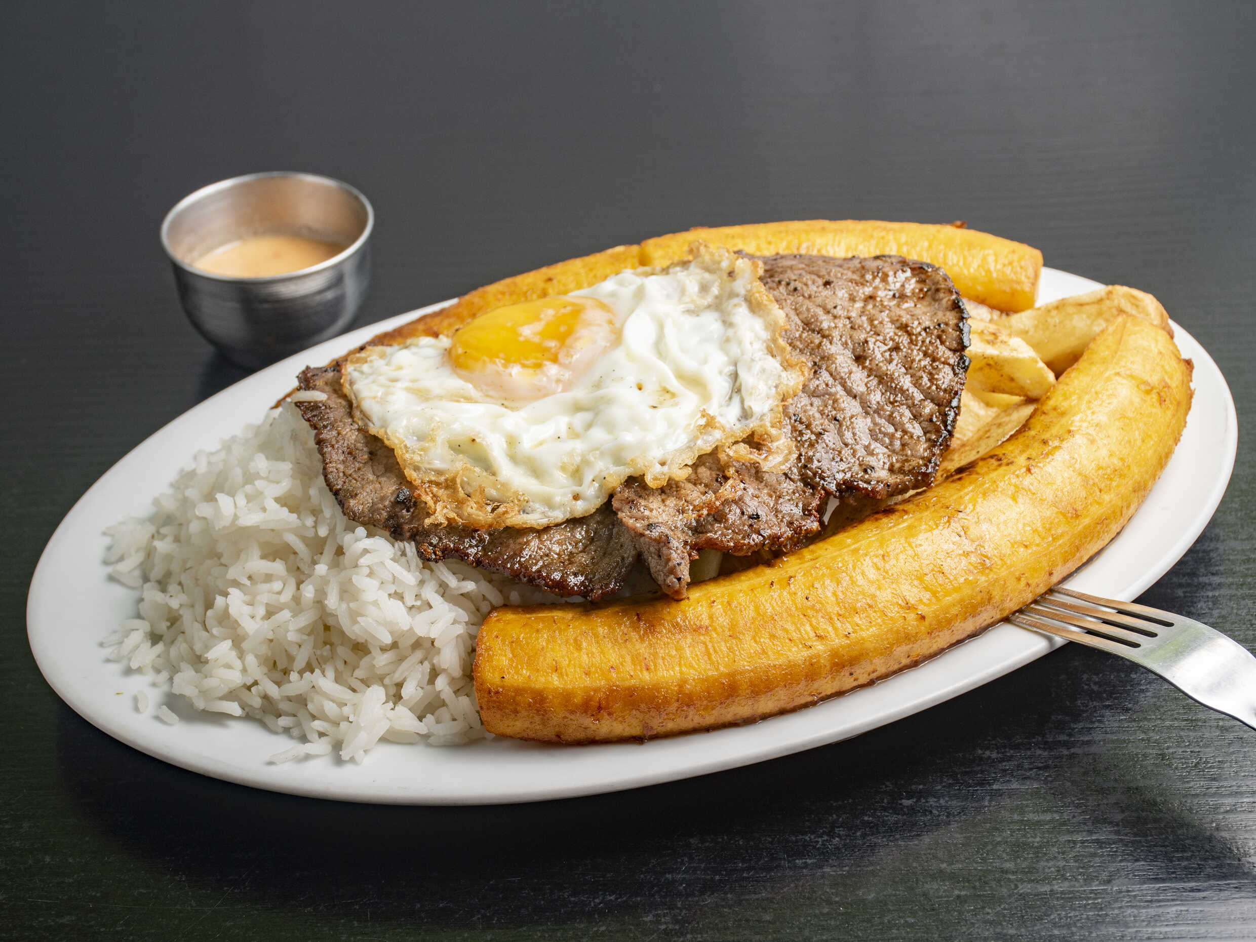Laja de bistec tierno con arroz, huevo frito, plátano y papas fritas