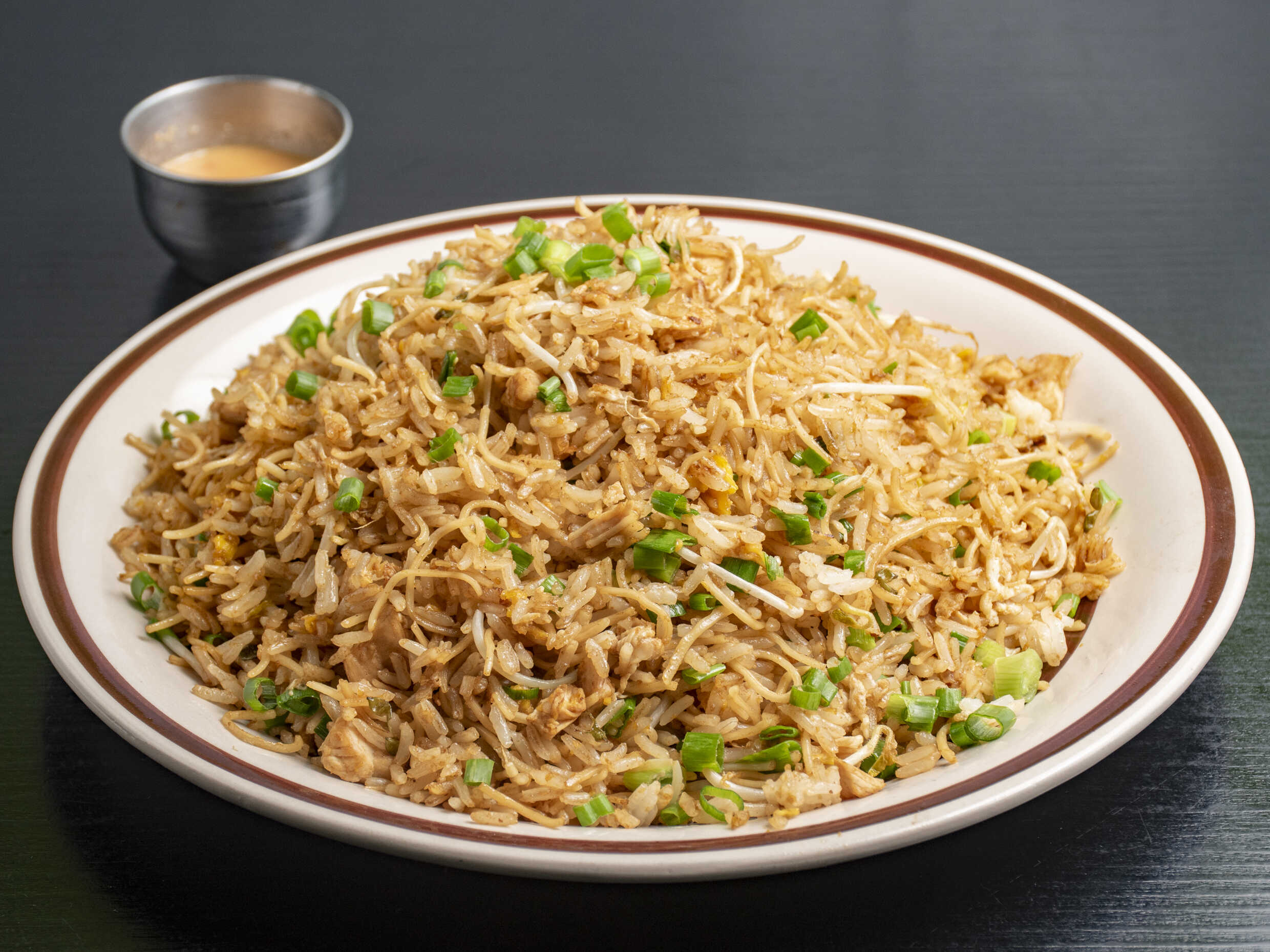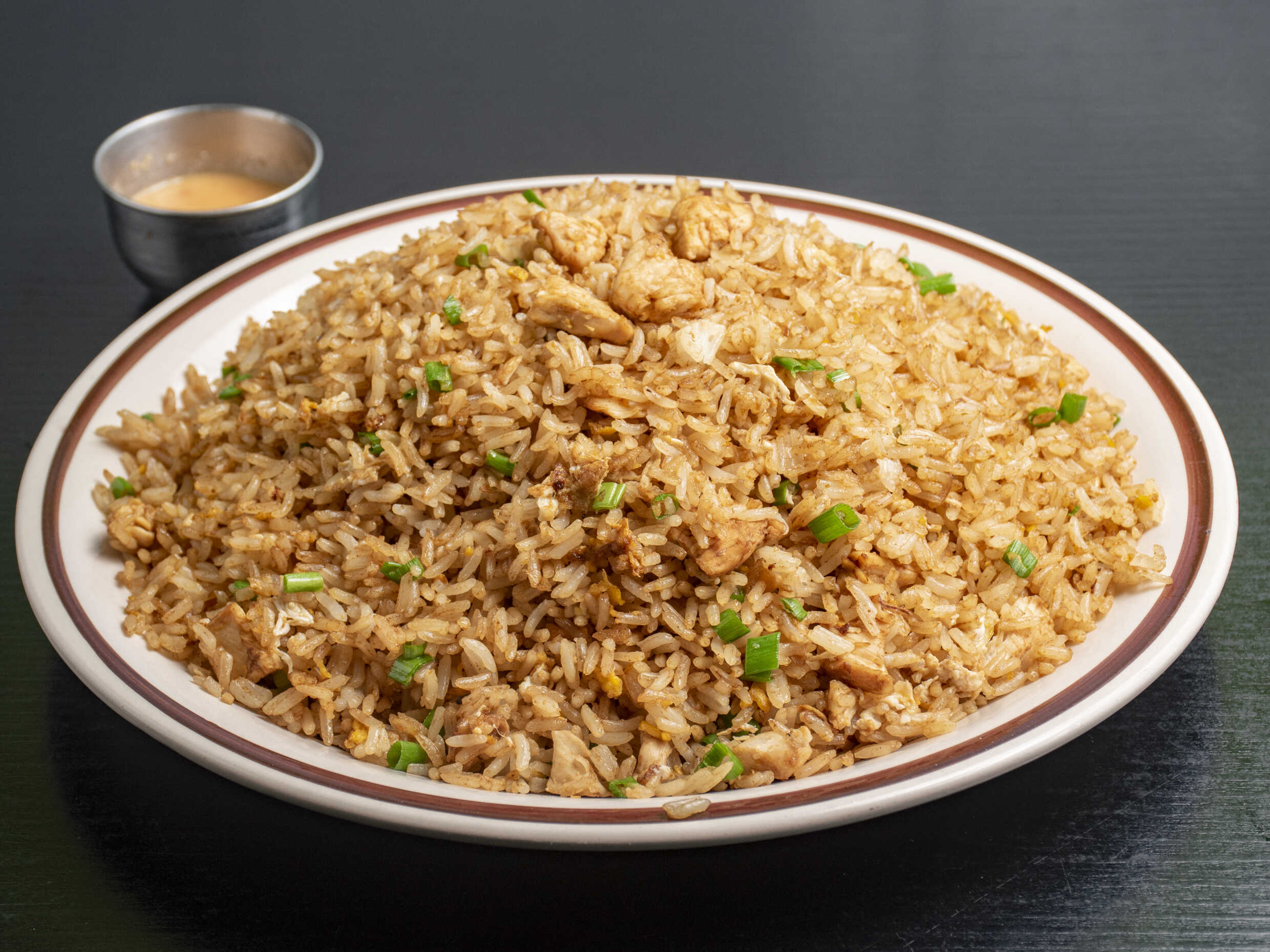 Arroz salteado estilo oriental con trozos de pollo.