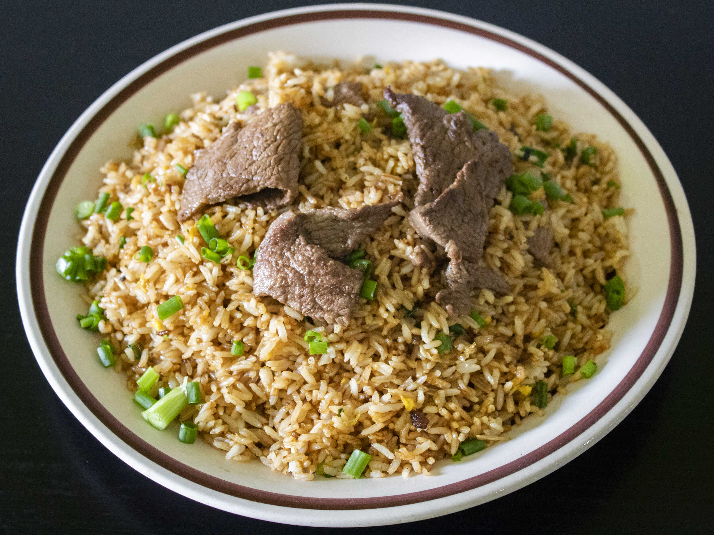 Arroz salteado estilo oriental con trozos de carne.