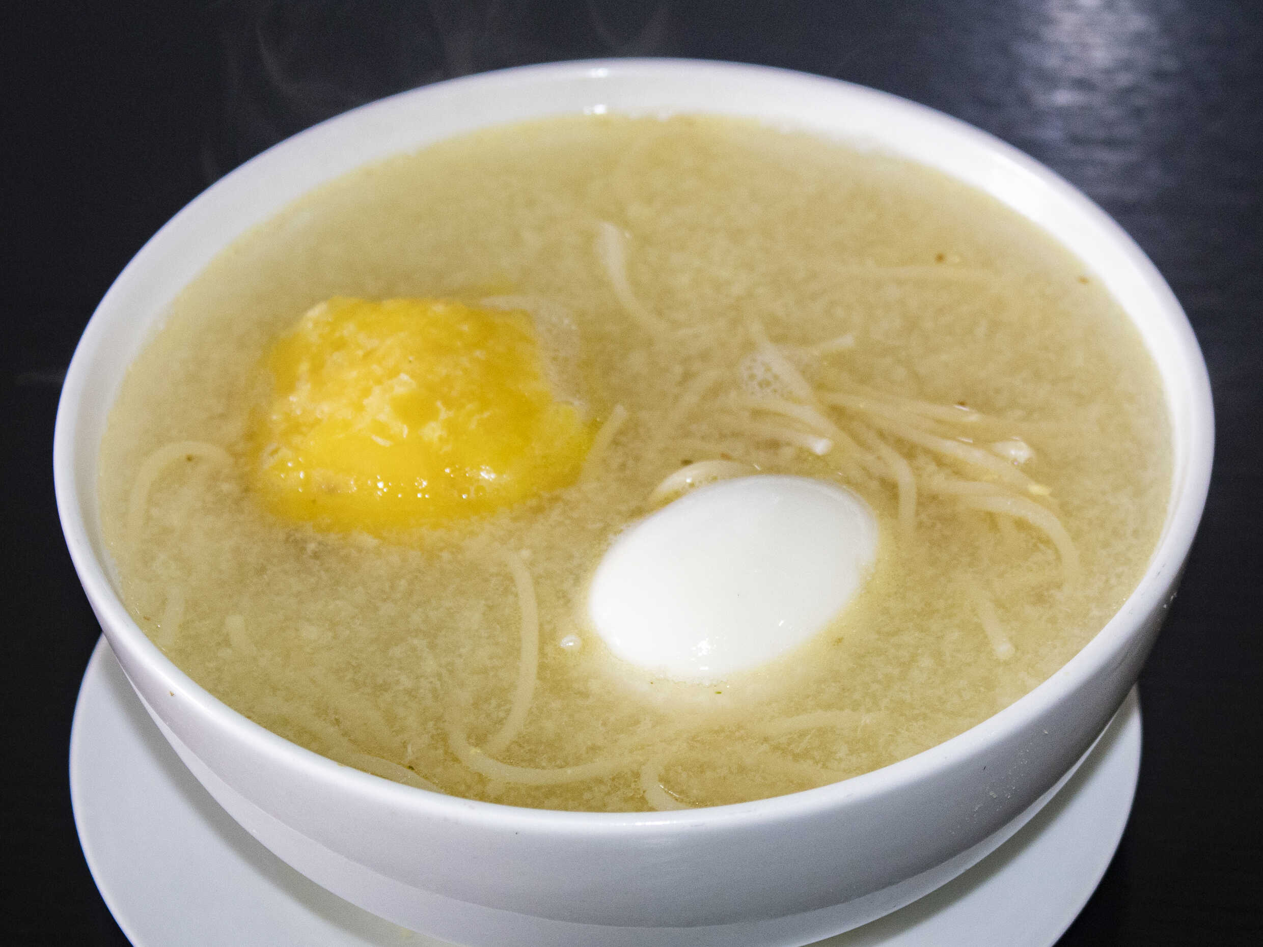 Caldo de gallina sin presa con huevo duro.