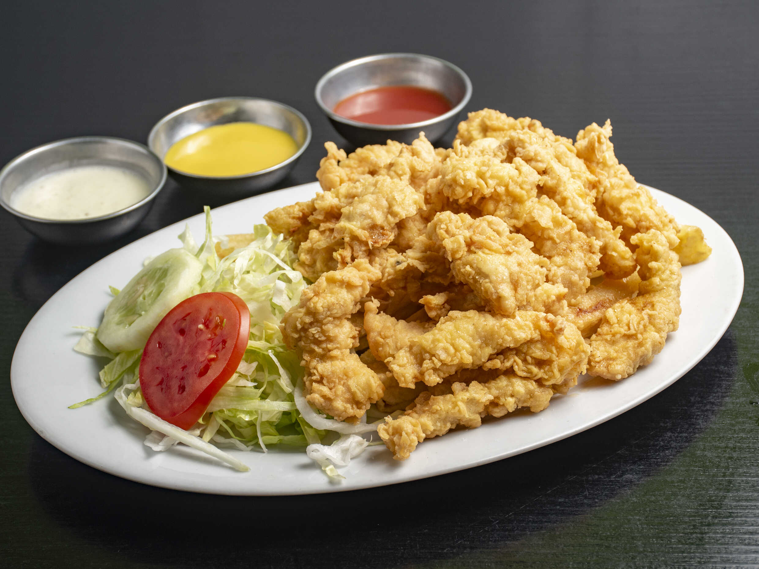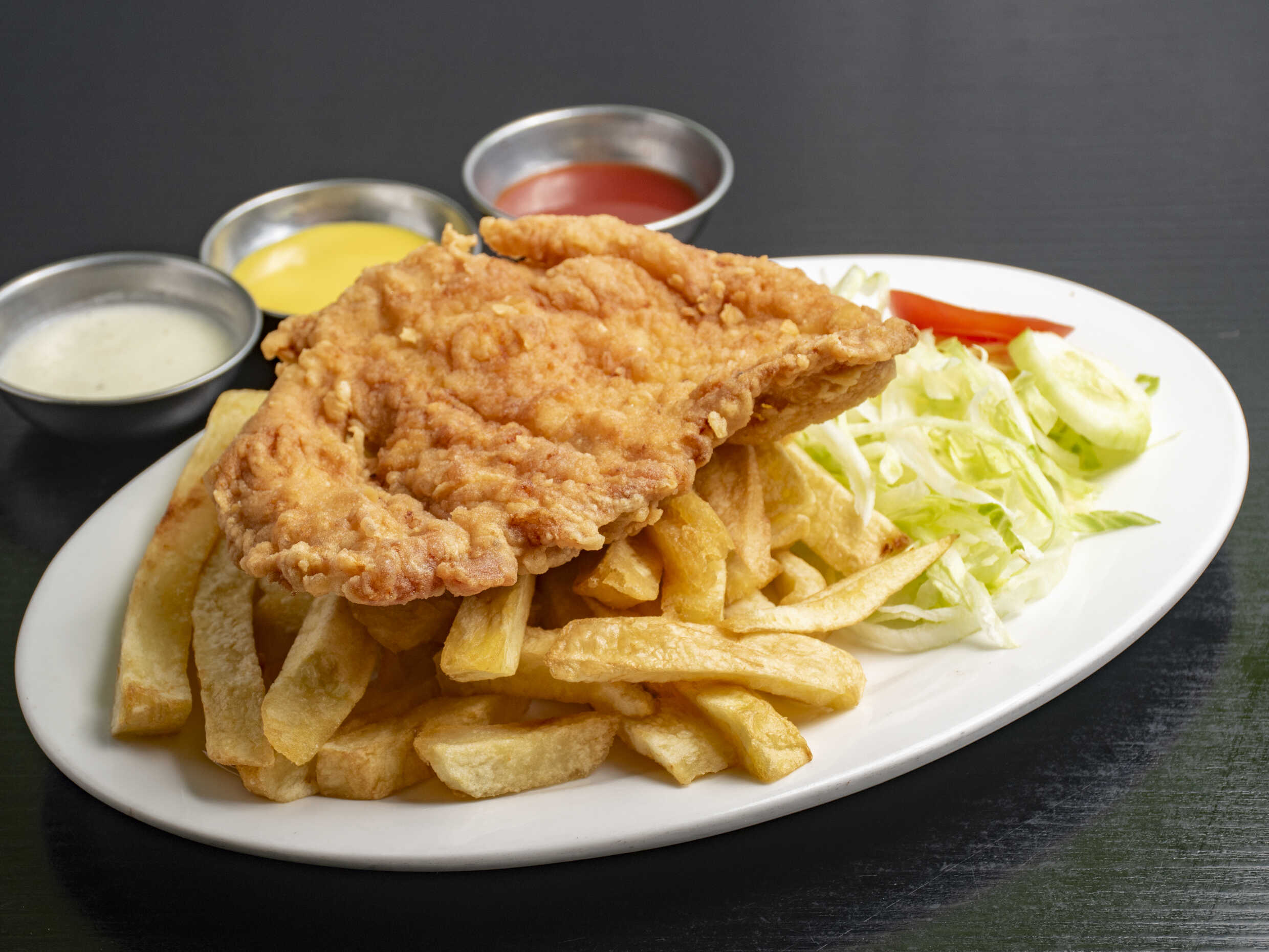 Entrepierna de pollo empanizada acompañada con papas, ensaladas y cremas.