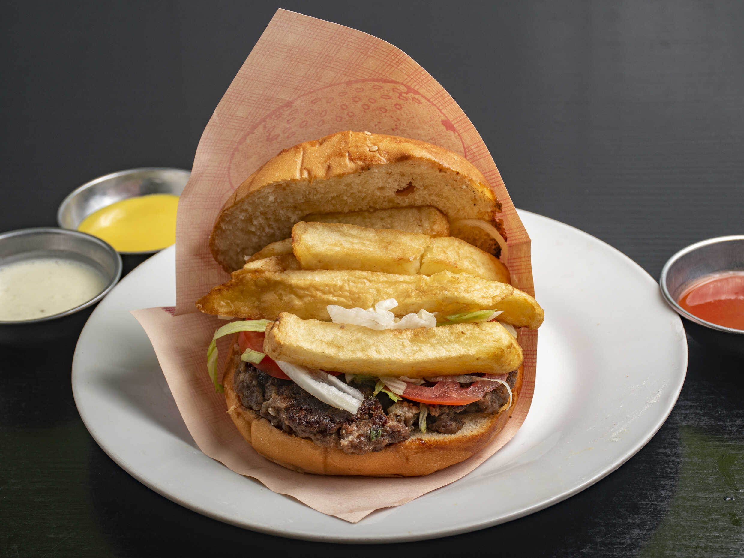 Hamburguesa preparada con receta de la casa, papas y ensalada.