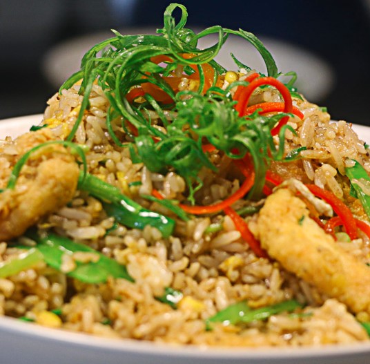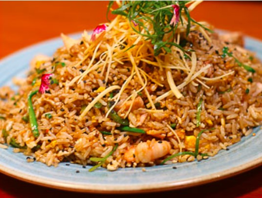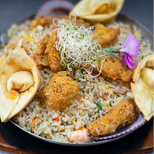 Arroz al wok con mariscos y pescados, acompañado de wantanes de pulpa de cangrejo.