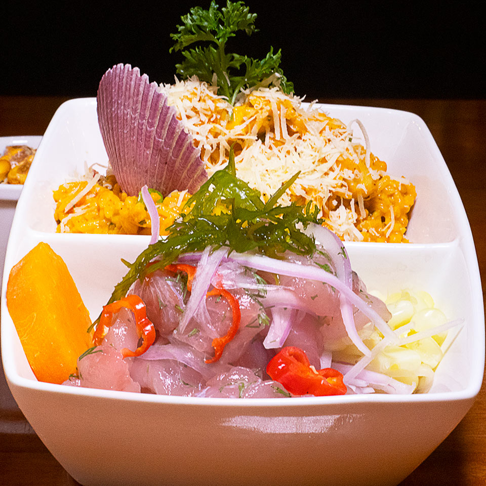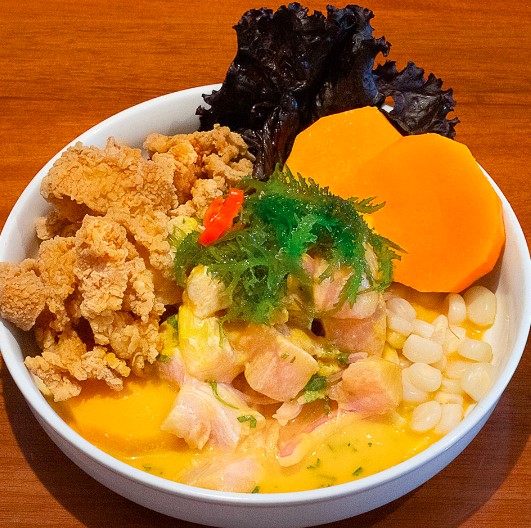 Láminas de pescado bañadas en leche de tigre a elección del cliente, acompañado con choclo y camote.