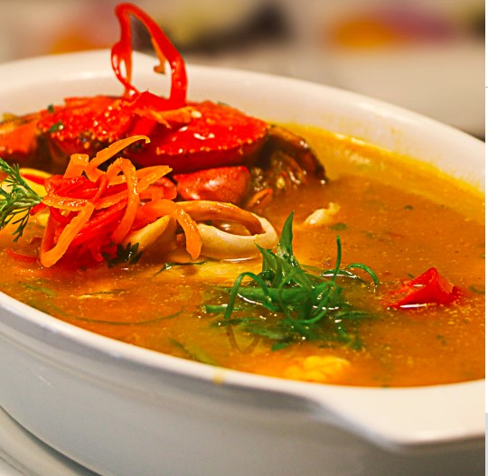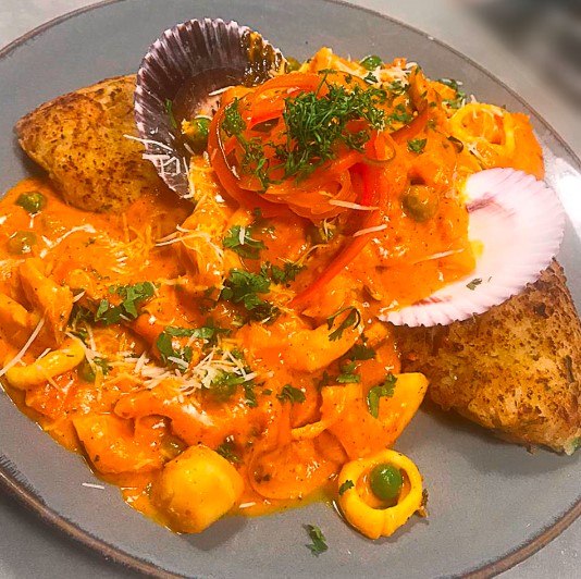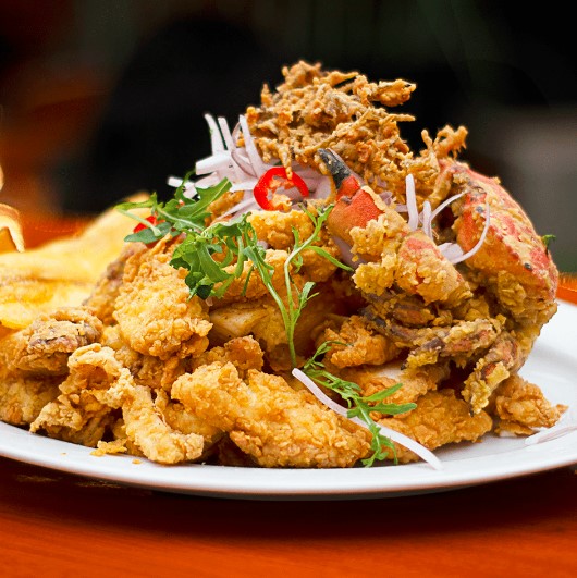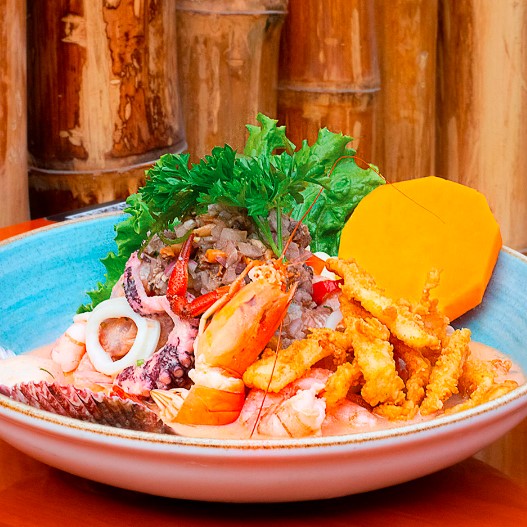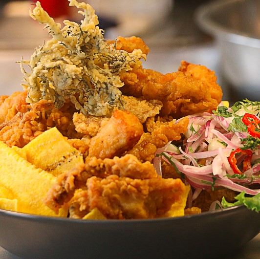 Crocantes trozos de pescado, mixtura de mariscos, cangrejo acompañado de yucas fritas y sarza criolla.