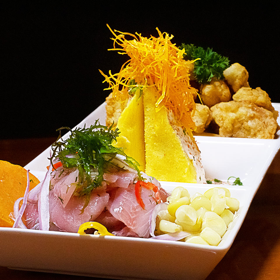 Trio de causas tradicionales, montadas con pulpa de cangrejo, pulpo al olivo y langostinos en salsa acevichada.