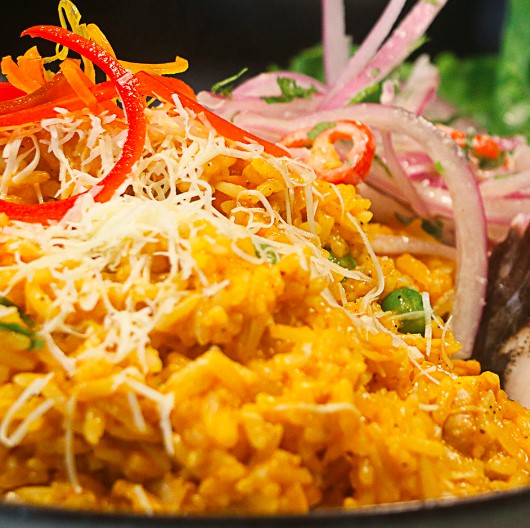 Arroz con frescos mariscos en salsa de la casa, acompañado de queso parmesano.