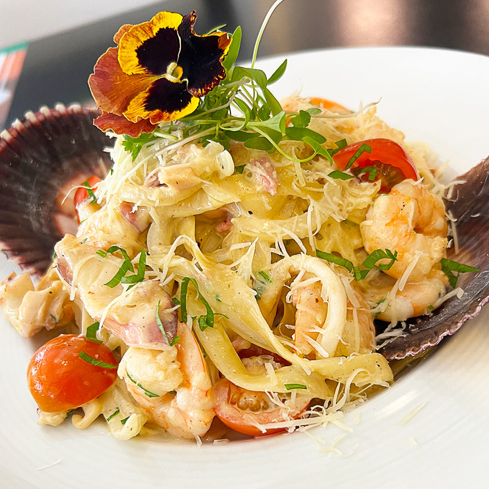 Fettucini a la Carbonara de Mariscos