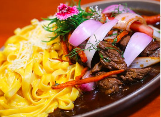 Fettucini a la Huancaína con Lomo Saltado
