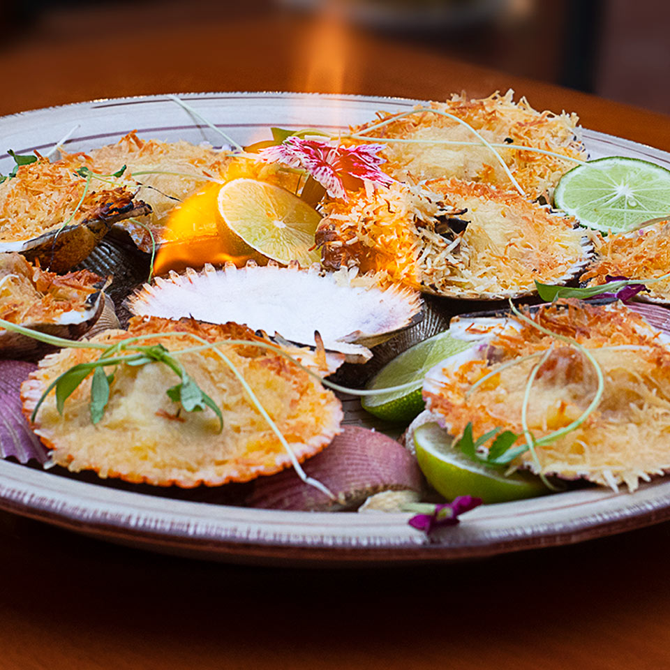 Conchitas marinadas con vino y limón, gratinadas con queso parmesano.