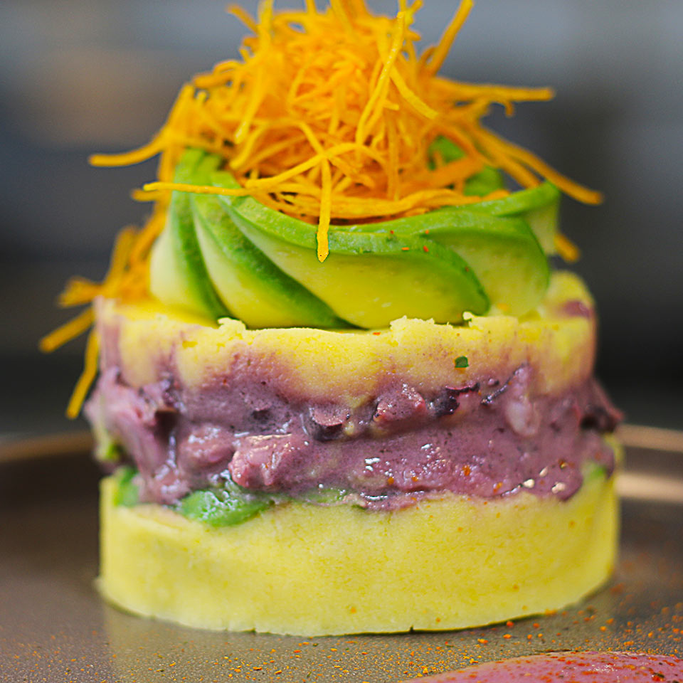 Tradicional causa de papa amarilla, rellena de pulpo y palta, bañada con salsa al olivo.